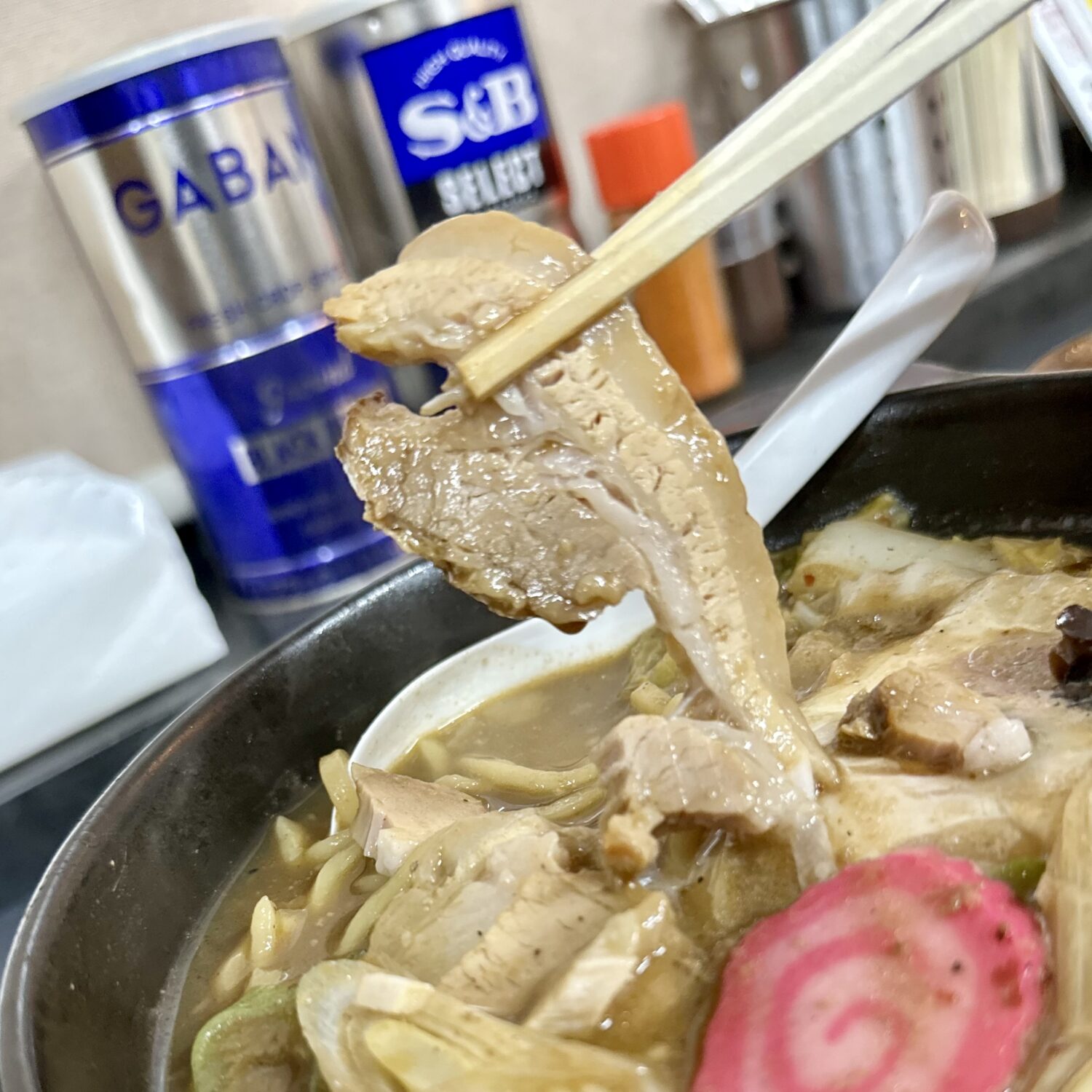 バラ肉チャーシューはホロトロすぎて箸で持つには至難の所業、一枚モノで持てれば奇跡的