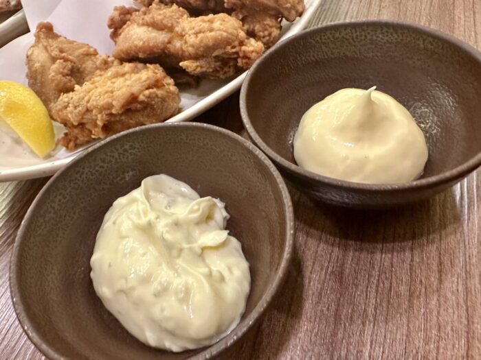 んでこの唐揚げがめっちゃデカイ、デカくて喉詰まるムネ肉のムッツニグで、けど見渡してもそこにマヨネーズなんて転がってもなくて