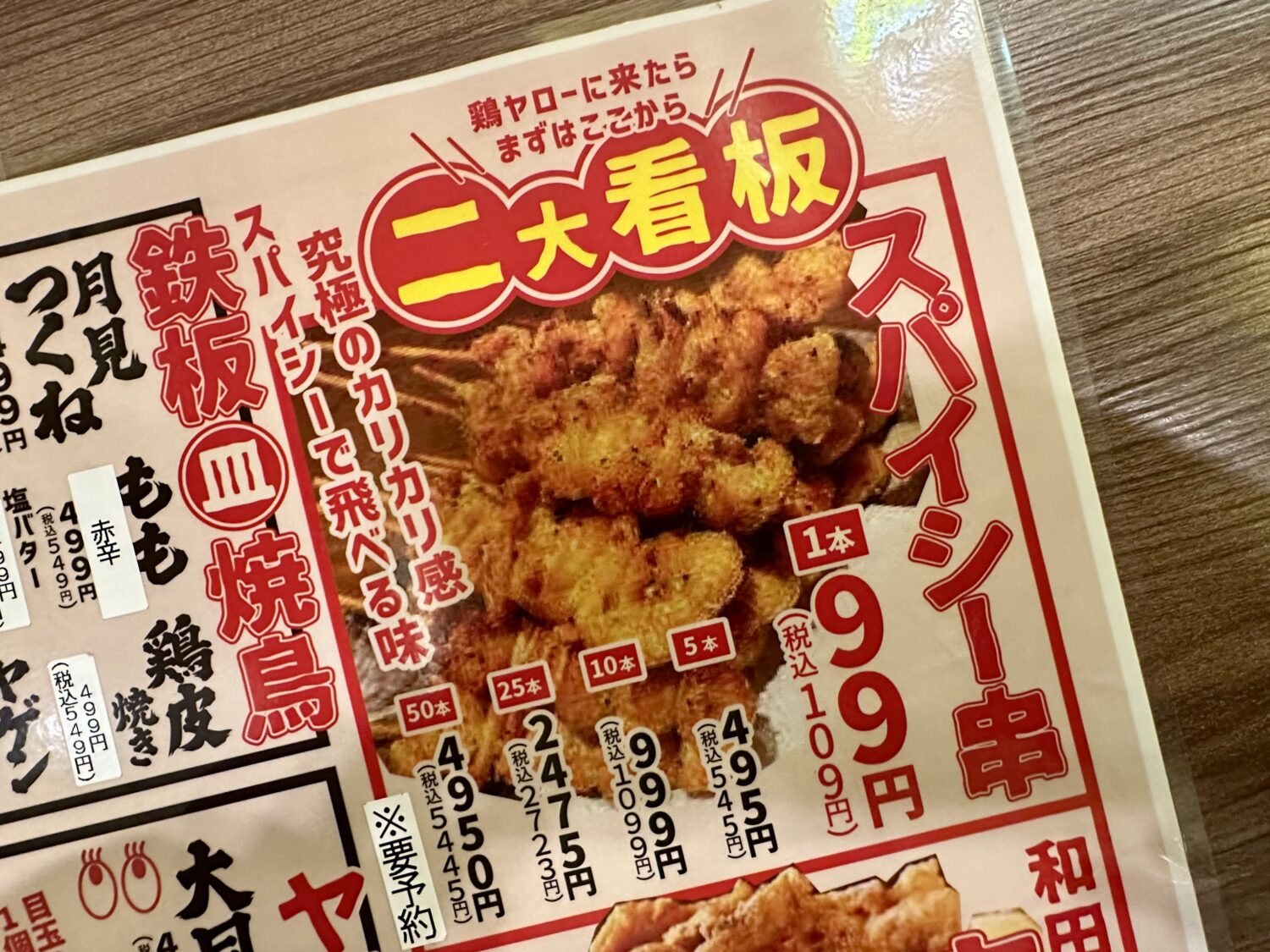 メニューにデカデカと書かれた“二大看板”の文字、その片翼「スパイシー串」を頼まず呑めるハズもなく