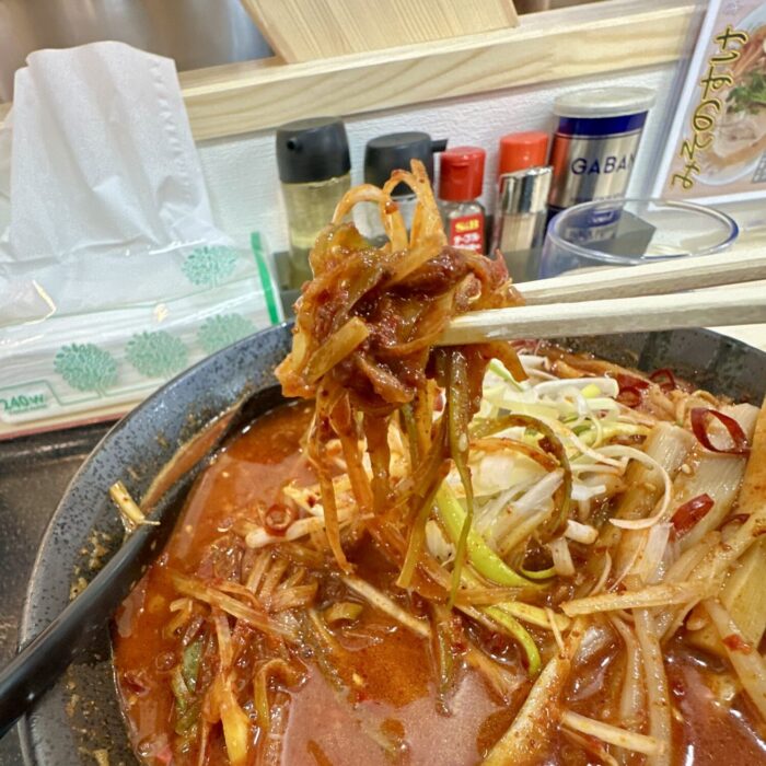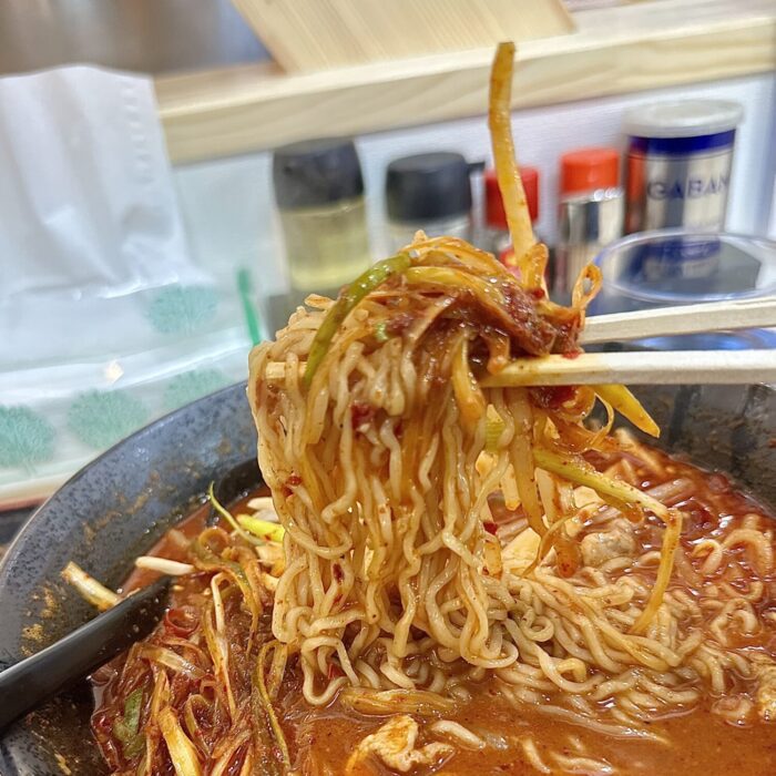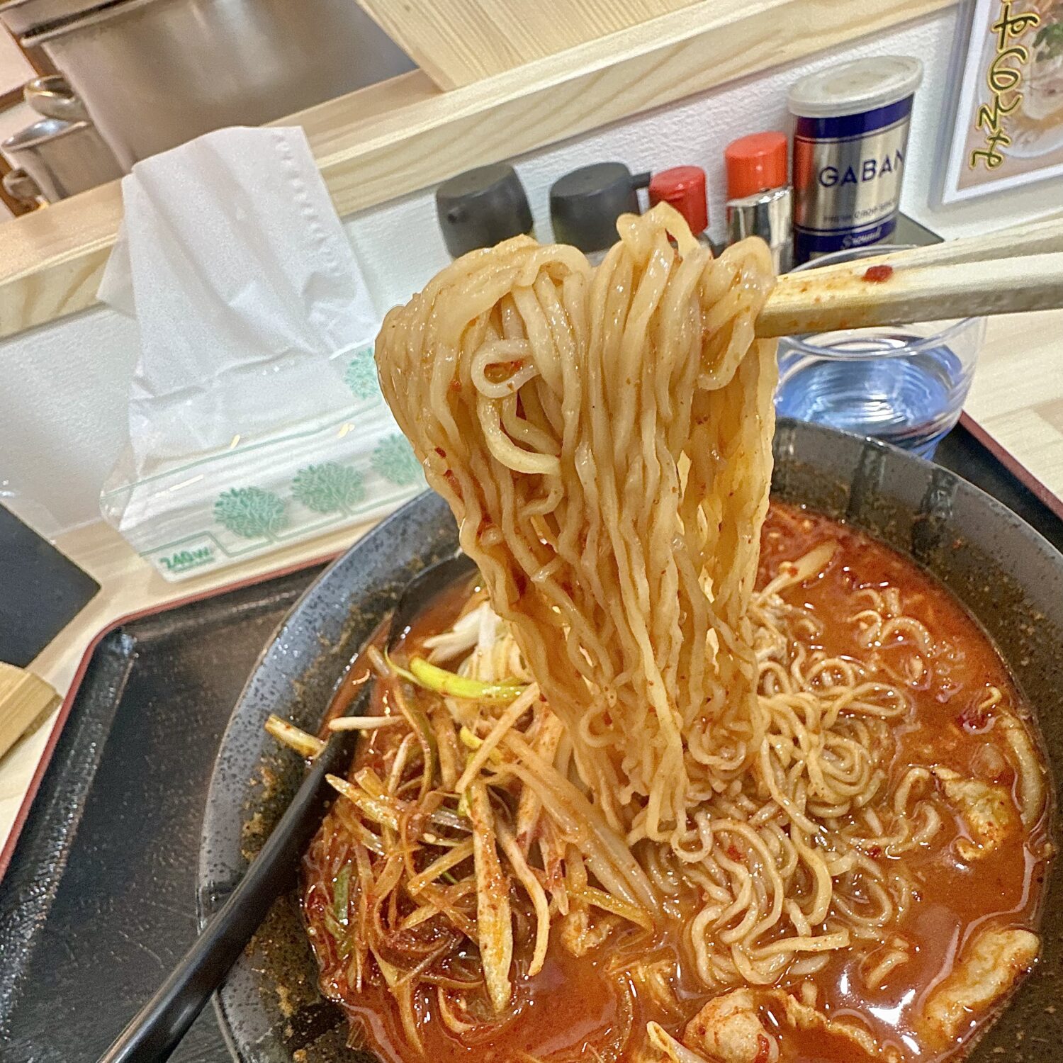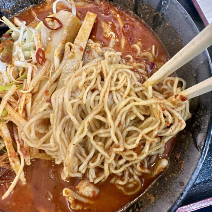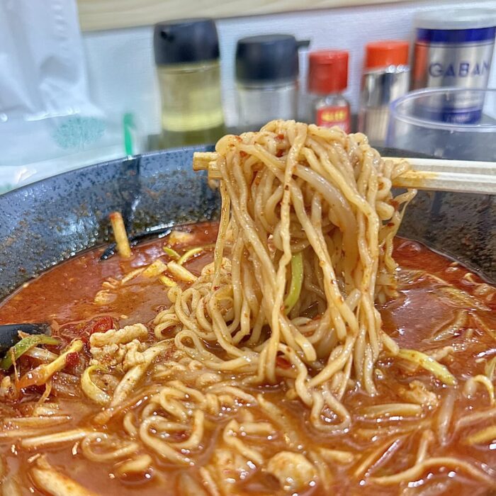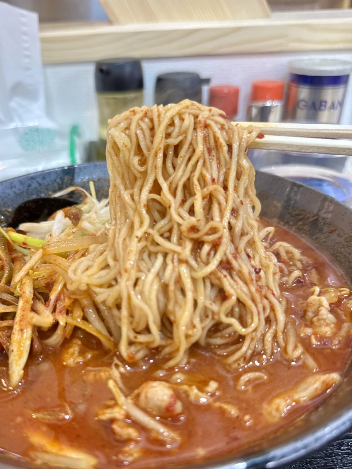 しかも何がエグいって、まるで破壊神みたいなこのスープに細ちぢれ麺を合わせてくるサディズムが恐ろしい