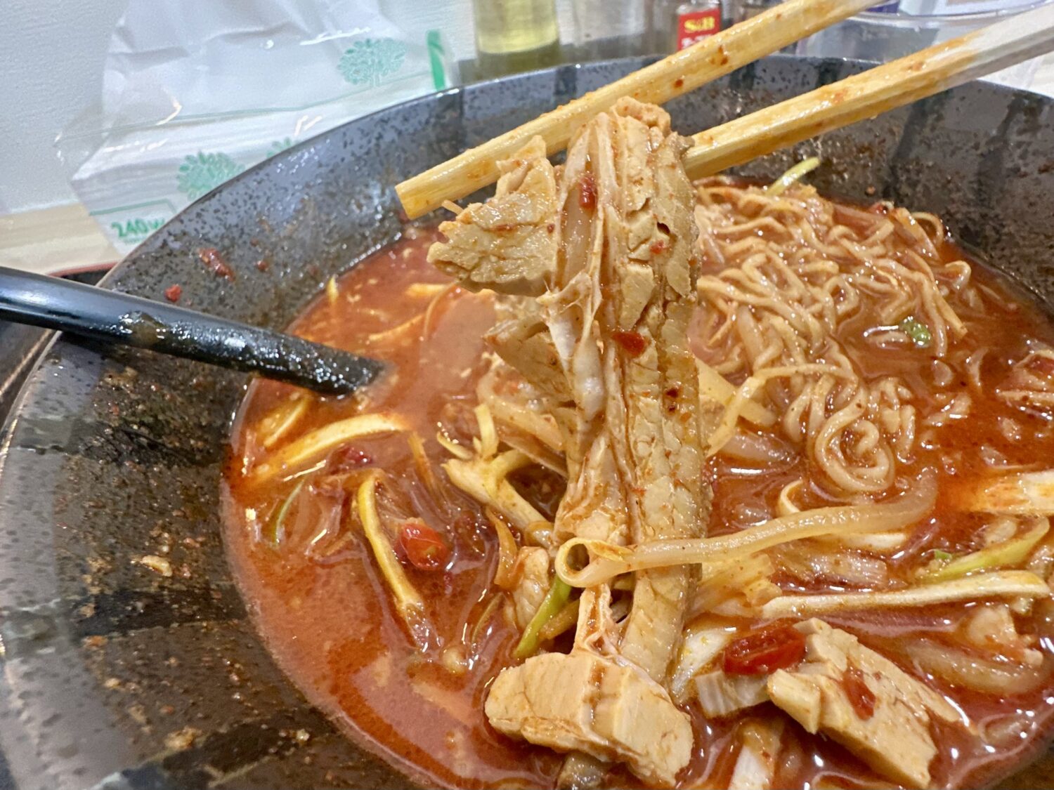 吸っちゃダメだ吸っちゃダメだ、からのハムハムコッキュン、、グハァッ!辛っらウッマッ!、刺さるような痛みが上顎焼いてて辛っらウッマッ!( ఠൠఠ;; )