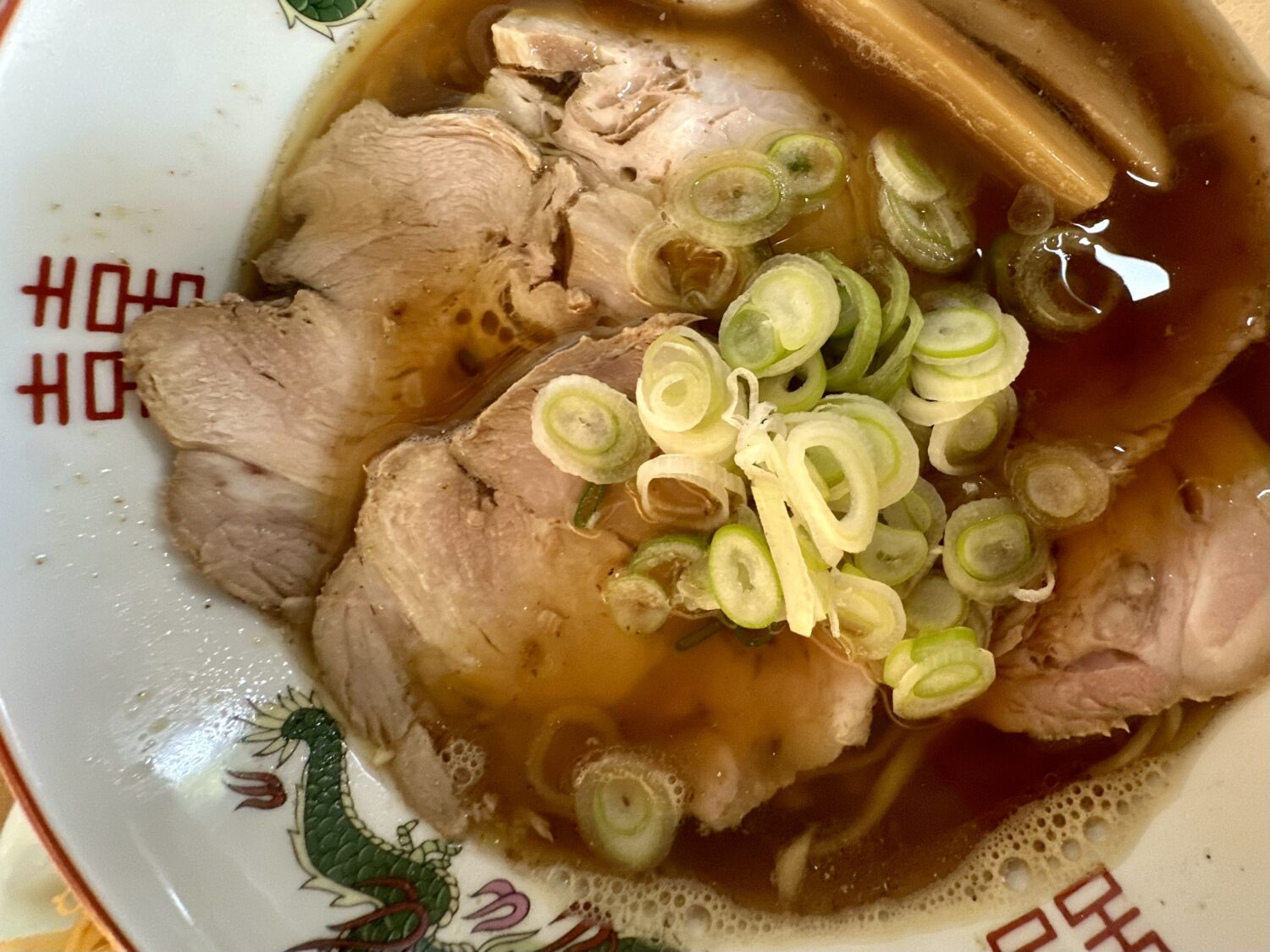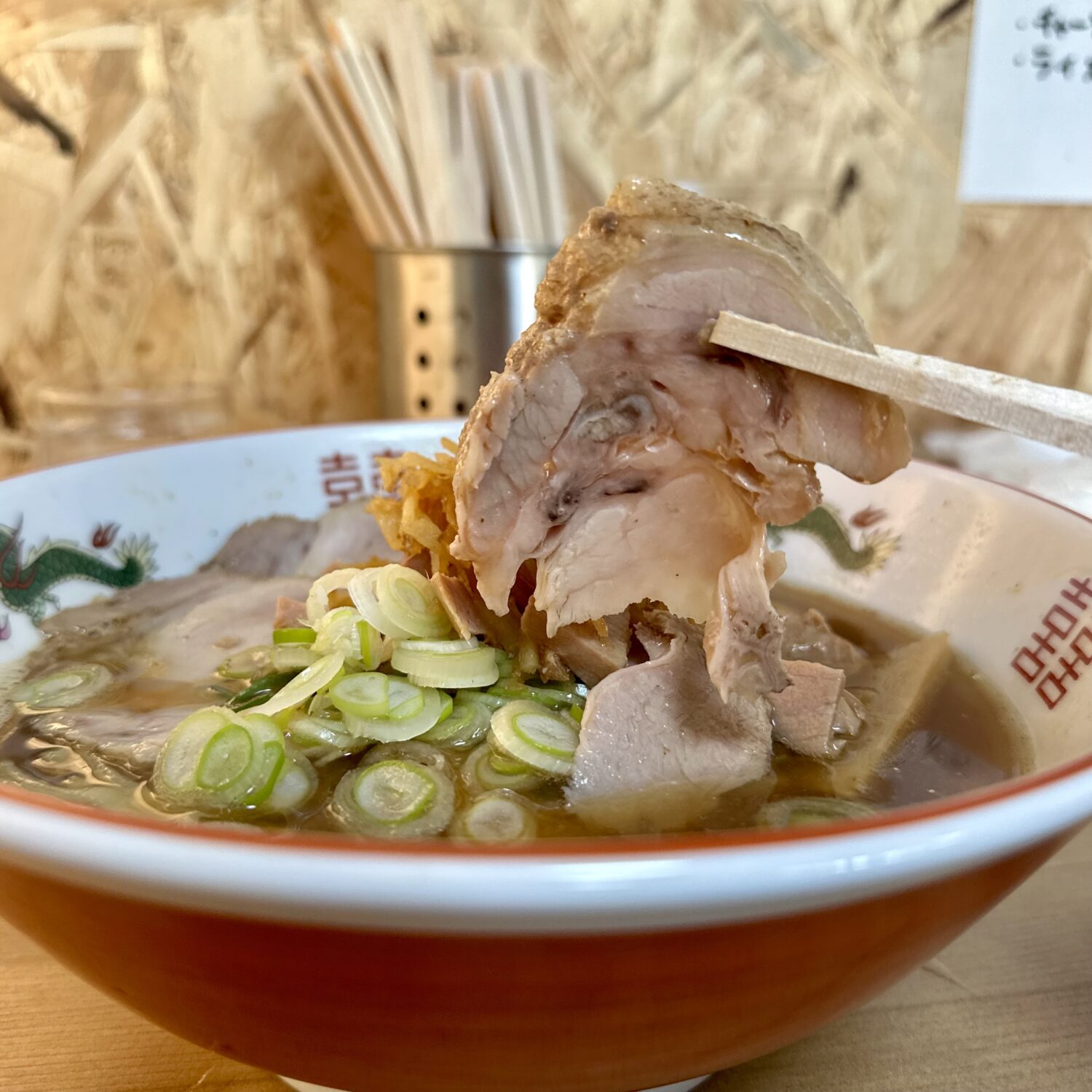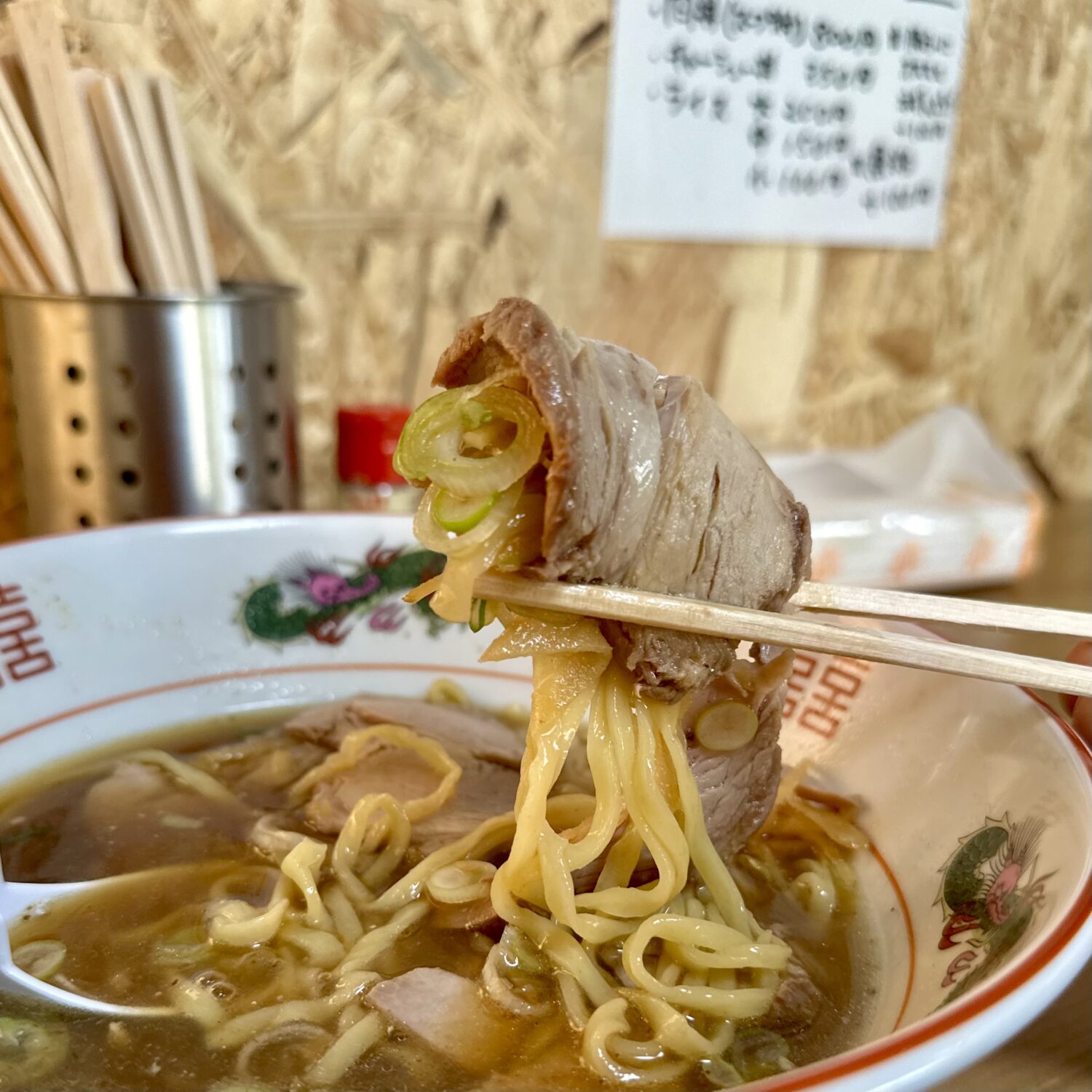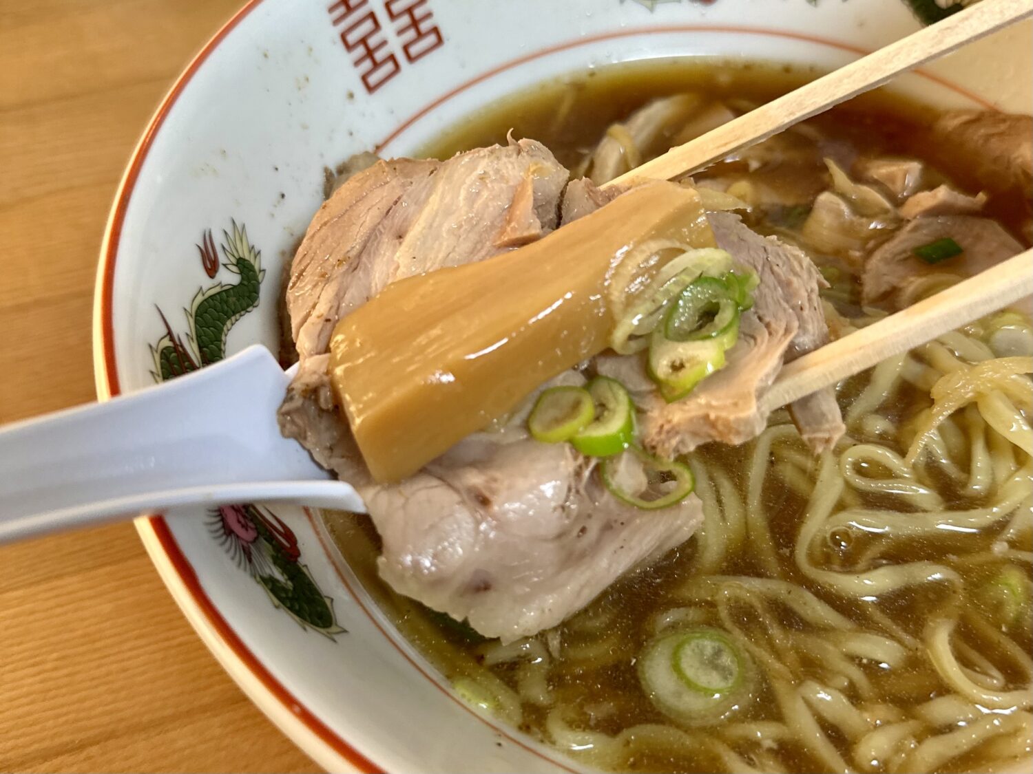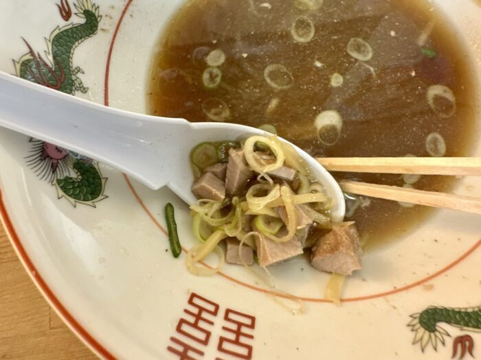 増しトッピングのチャーシュー以外、乗せ具としてはネギとメンマの王道コンビ