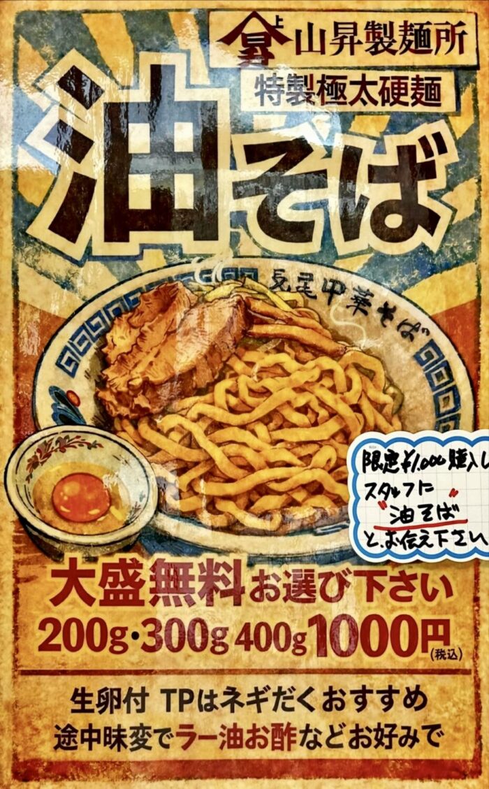 長尾グループの製麺部門「山昇製麺所」謹製の””特製極太硬麺”、その旨味強みをもっとも活かすためのアブラソバ、しかも県外有名店にもまったくヒケをとらないクオリティ、っていう。