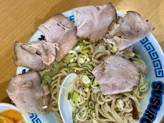 同じく”油そば”提供中の西バイパス店とはチャーシューの扱いが違うっぽくて、こちら東バイパス店では薄スライスのシットリニグが計6枚