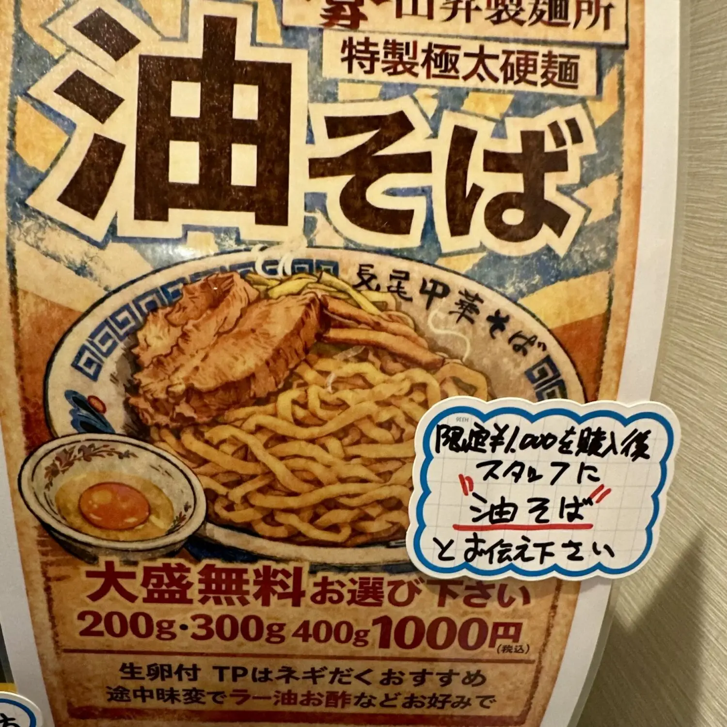 長尾グループの製麺部門「山昇製麺所」謹製の””特製極太硬麺”、その旨味強みをもっとも活かすためのアブラソバ、しかも県外有名店にもまったくヒケをとらないクオリティ、っていう。