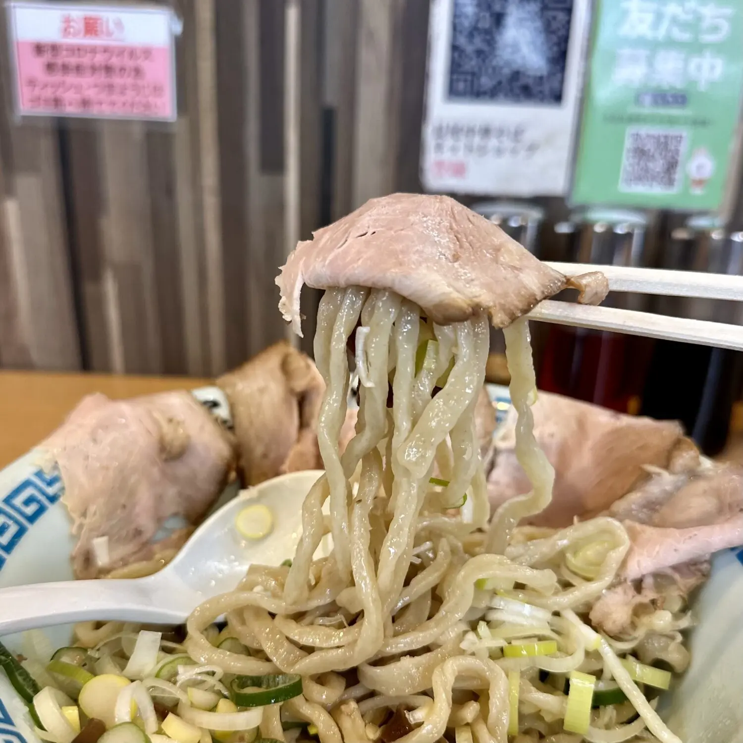 同じく”油そば”提供中の西バイパス店とはチャーシューの扱いが違うっぽくて、こちら東バイパス店では薄スライスのシットリニグが計6枚