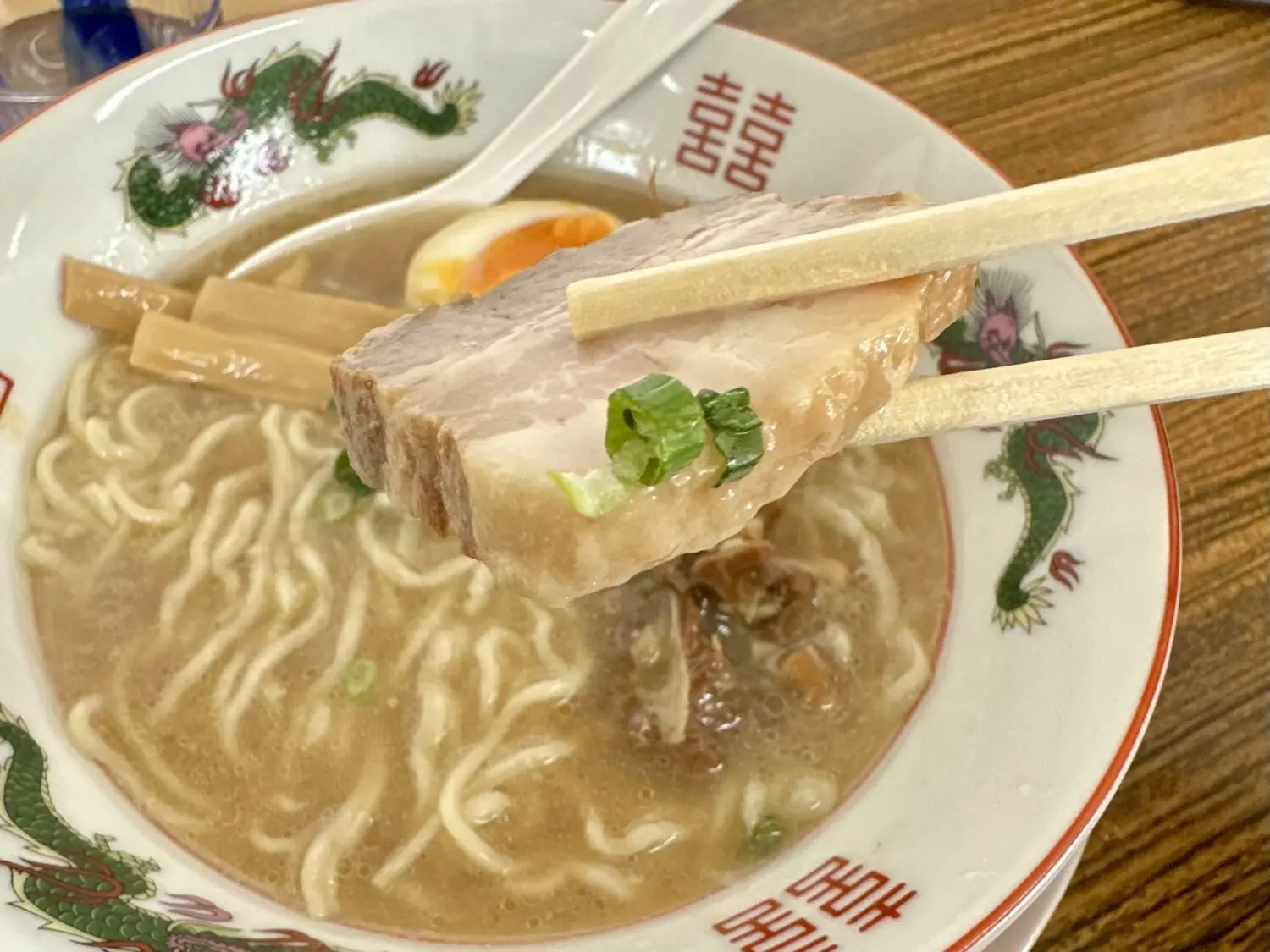そこに乗っかるネギメンマに味玉ハーフ、さらにプルプルコラーゲンなパイカと厚切りチャーシューがアイキャッチーすぎてハァハァしちゃう
