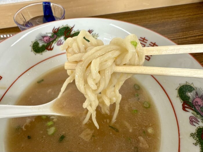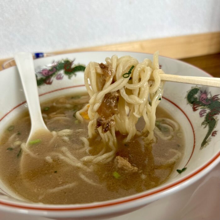 スープの印象はただただ控えめ、ぬるすぎるスープともあって追いカエシが欲しくなる味付け具合。