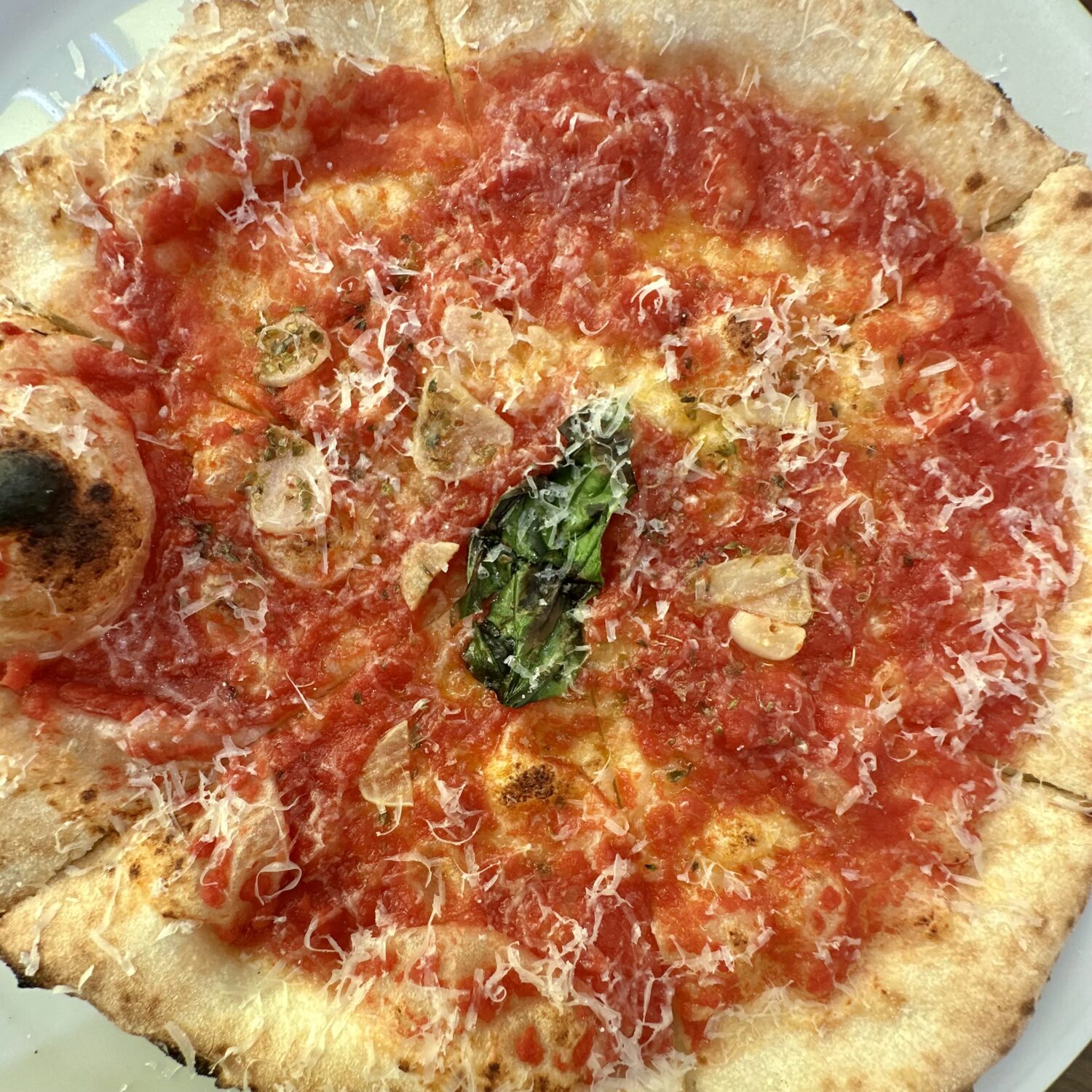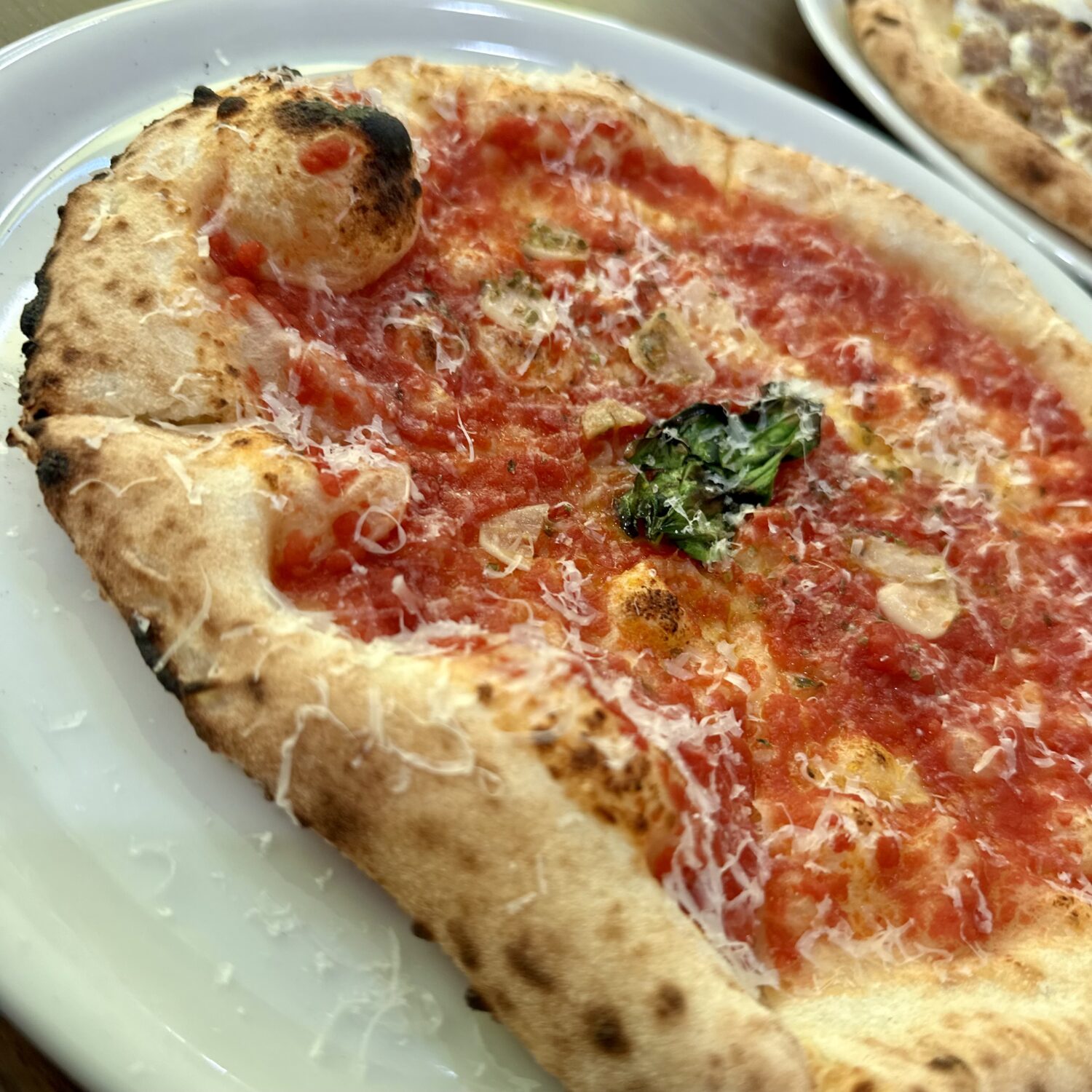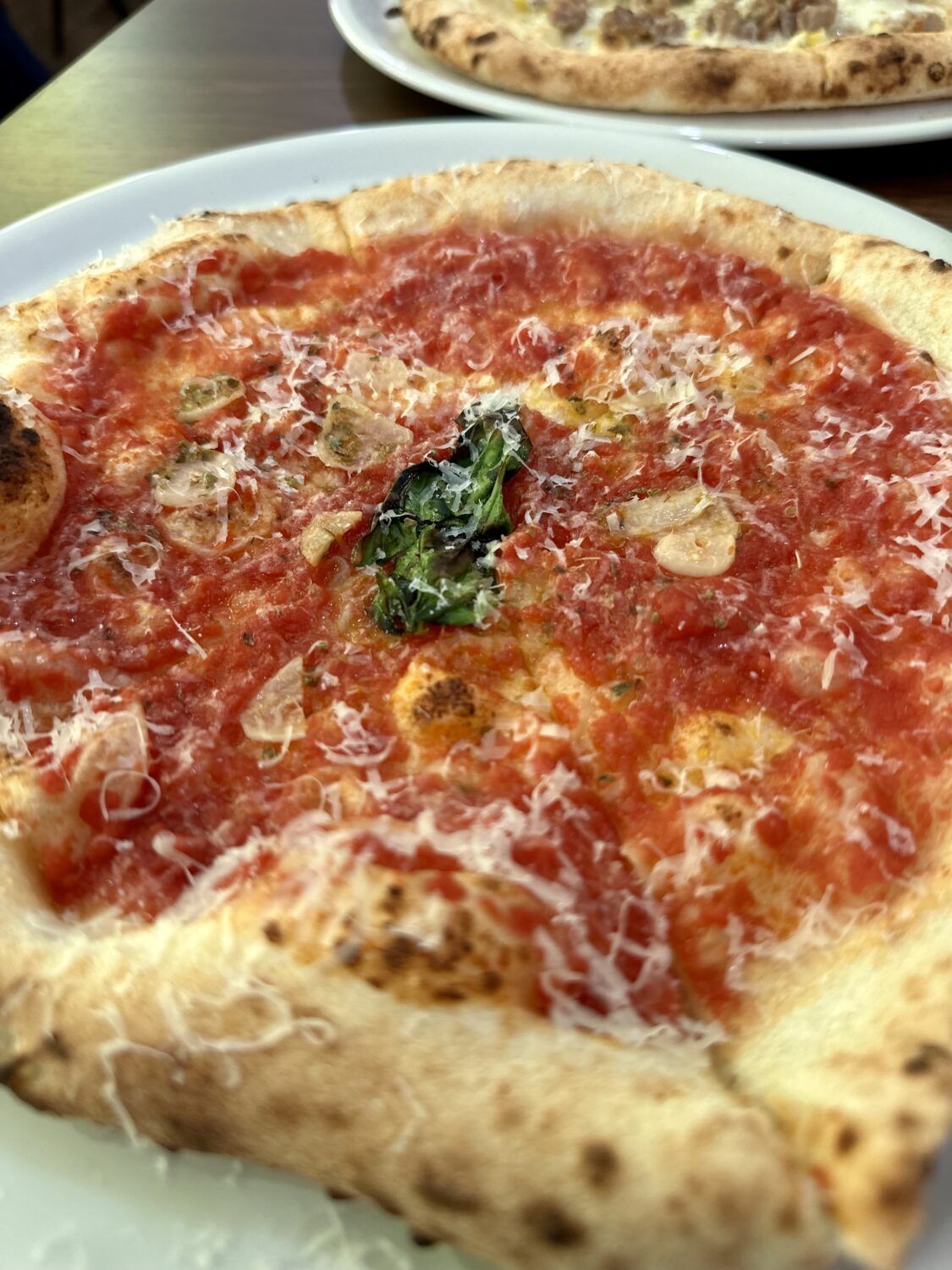 トマトベースのピザで、その構成要素はニンニク・オレガノ・ペコリーノロマーノ、もちろんメニューに書いてるまんまの情報