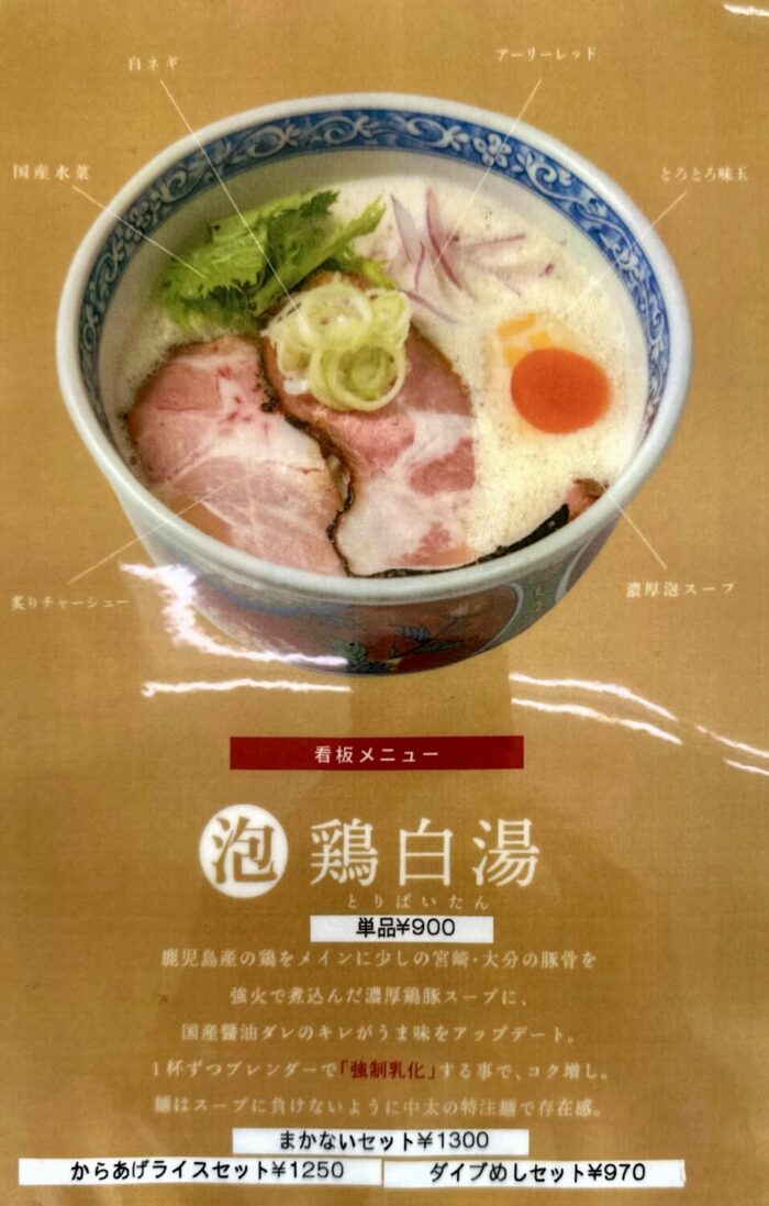 『鹿児島産の鶏に少しの豚骨を加えた濃厚スープに国産醤油でキレをプラス、さらに1杯ずつブレンダーで「強制乳化」する事でコクUP!』、