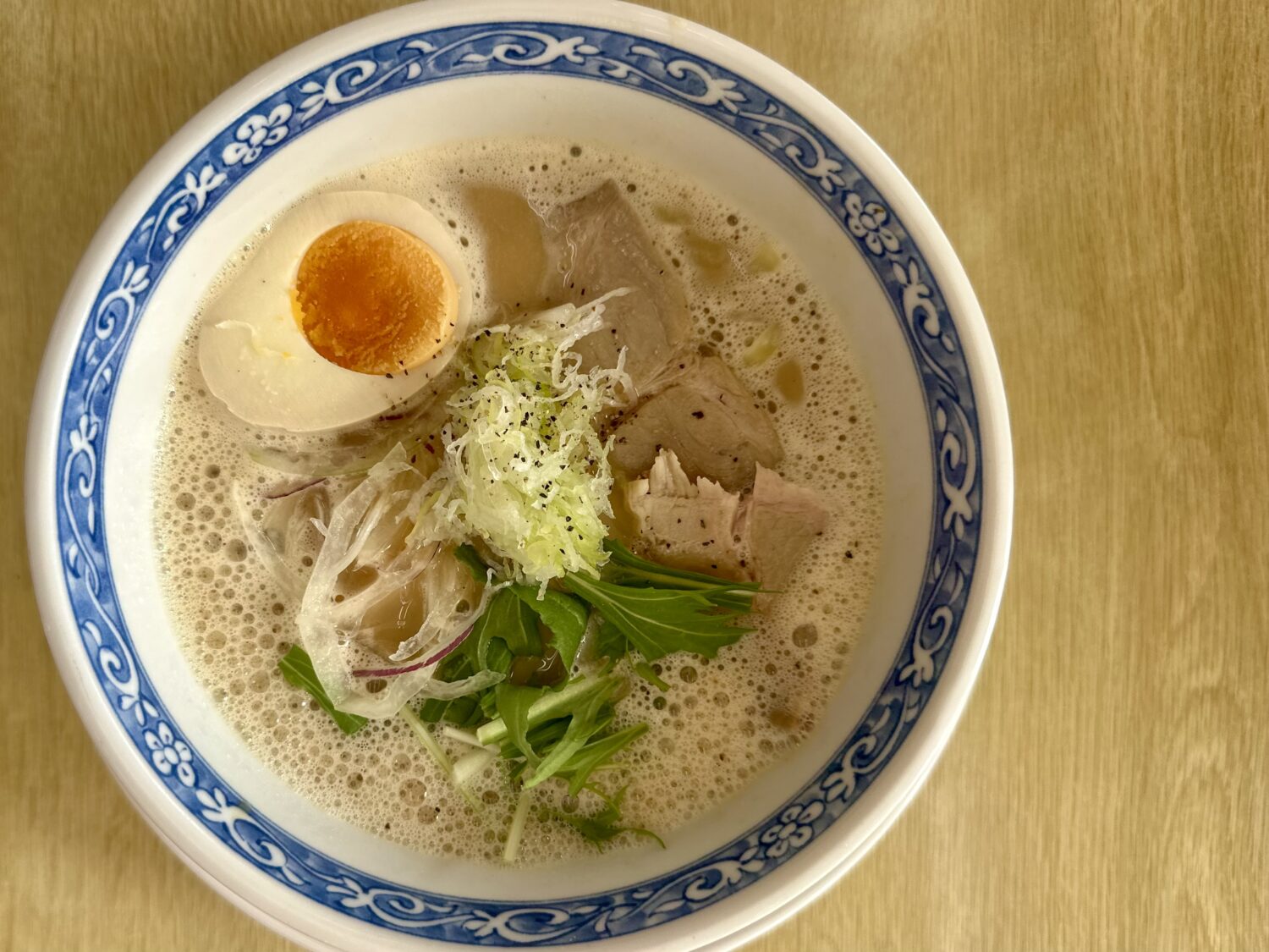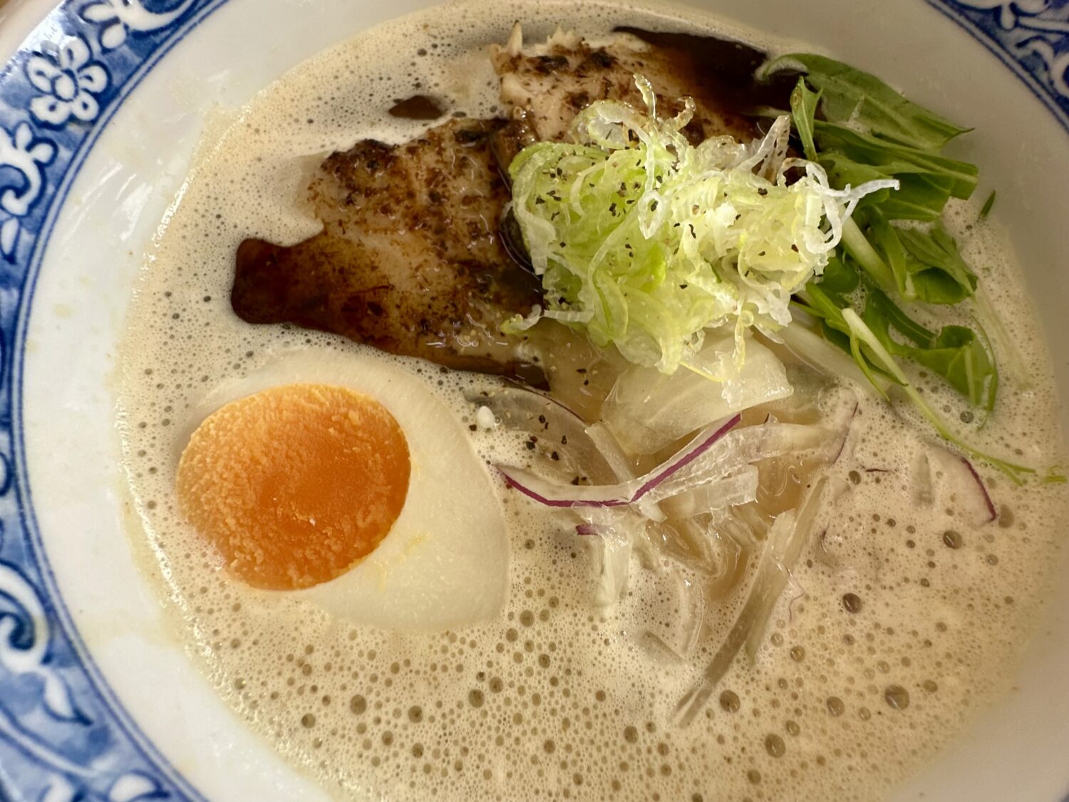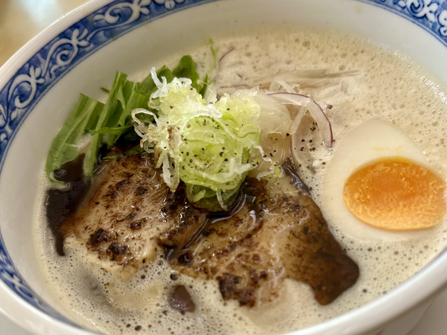 乗せ具は炙りのチャーシュー、白ネギ、国産水菜にアーリーレッド、そして味玉とスキはなし