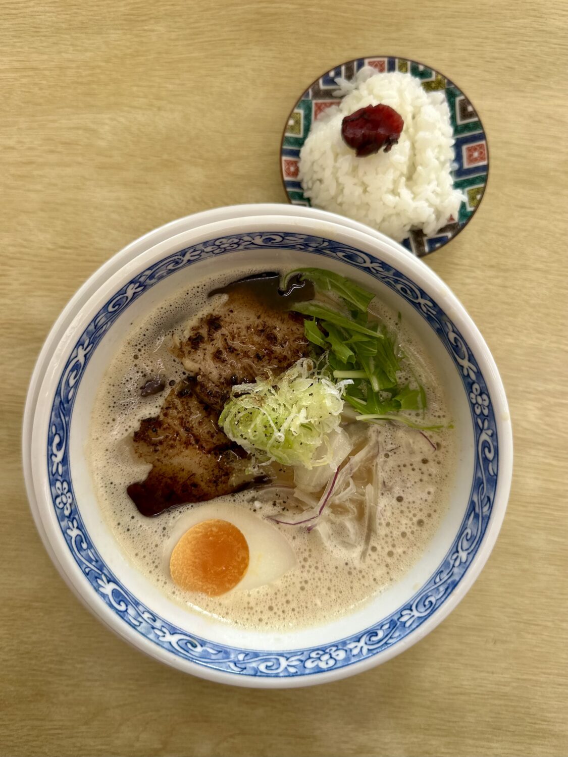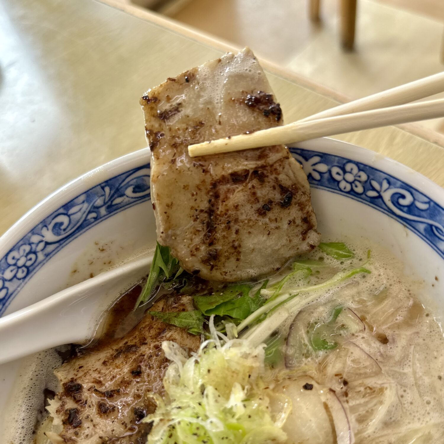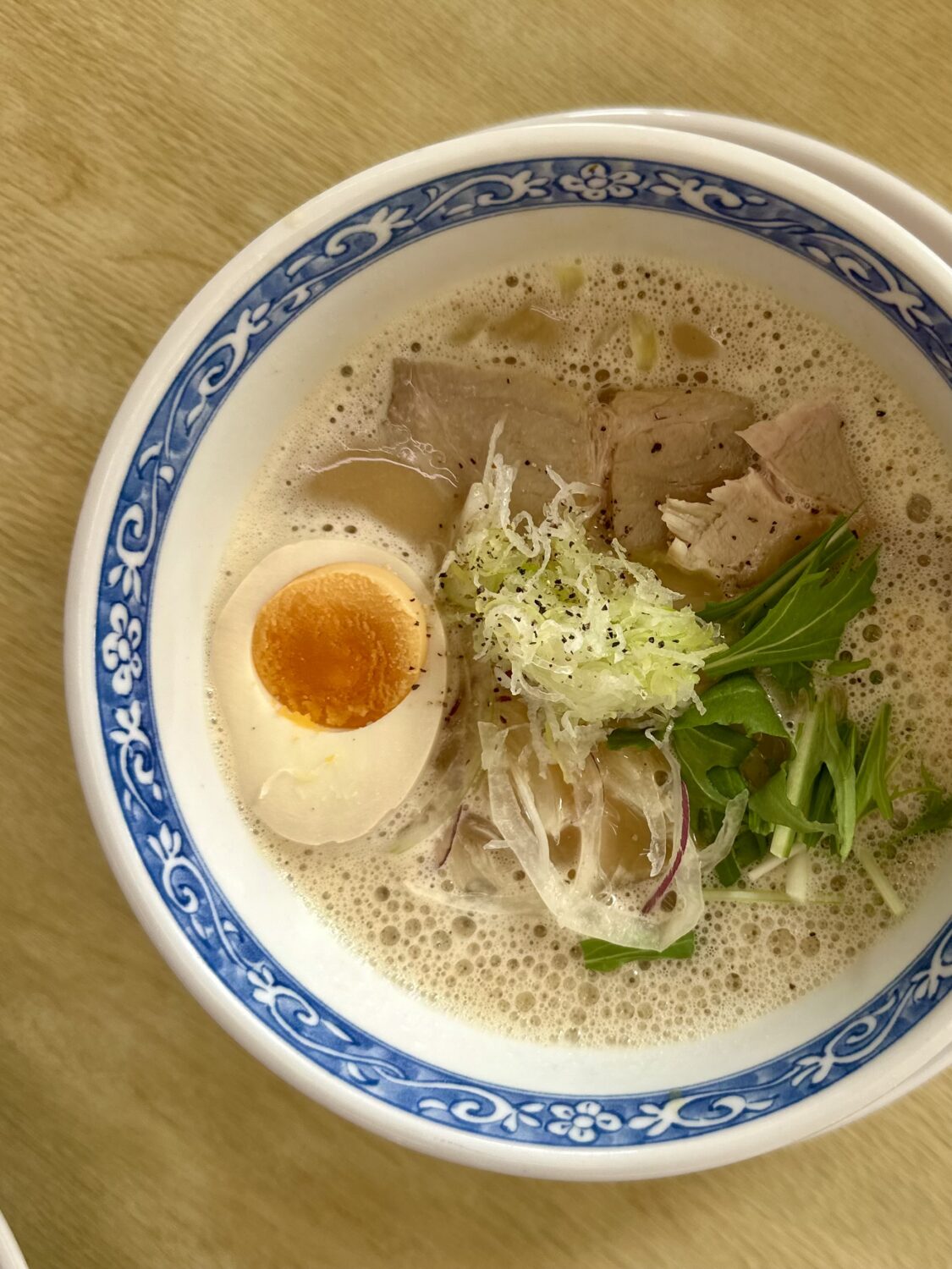 乗せ具は炙りのチャーシュー、白ネギ、国産水菜にアーリーレッド、そして味玉とスキはなし