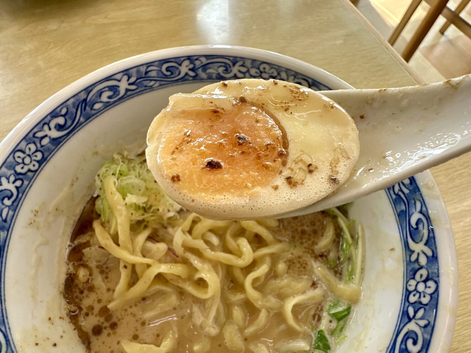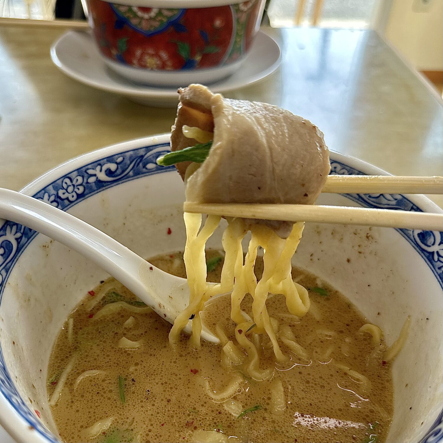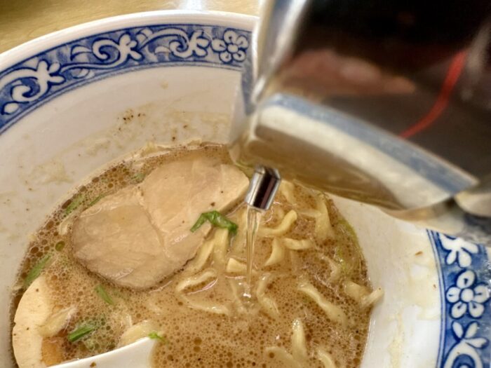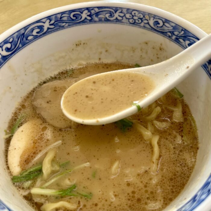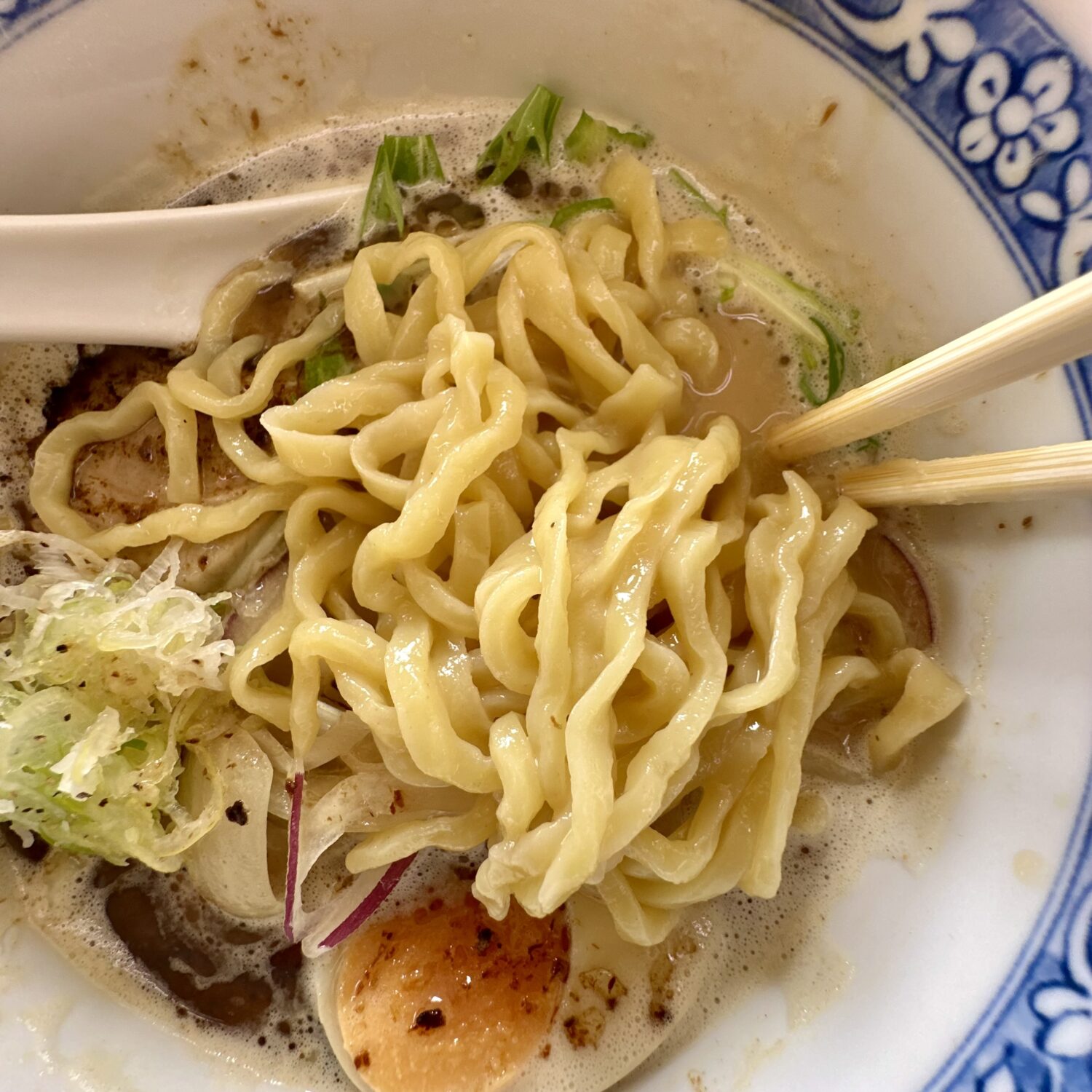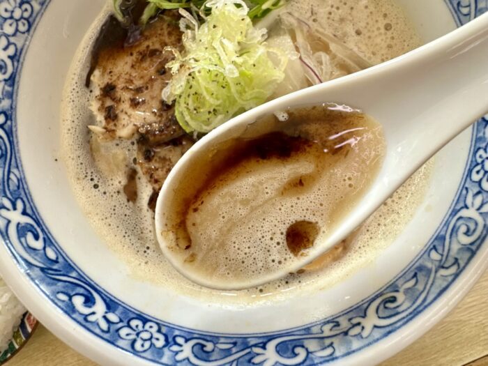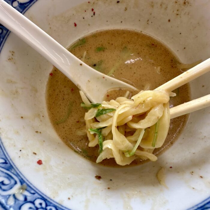 スープは舌に優しいほんのり温度と、粘度少なめで意外とスッキリした飲み口、そこにヌルラと光る特注ウネリ麺が絡んで口内ちょっとしたカーニバル。