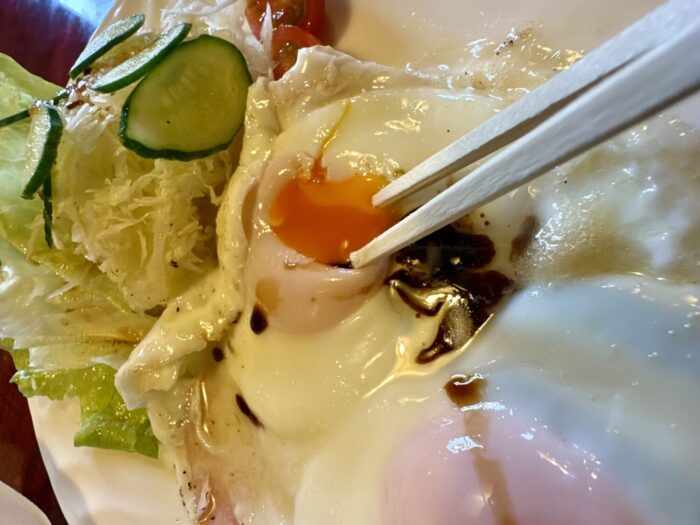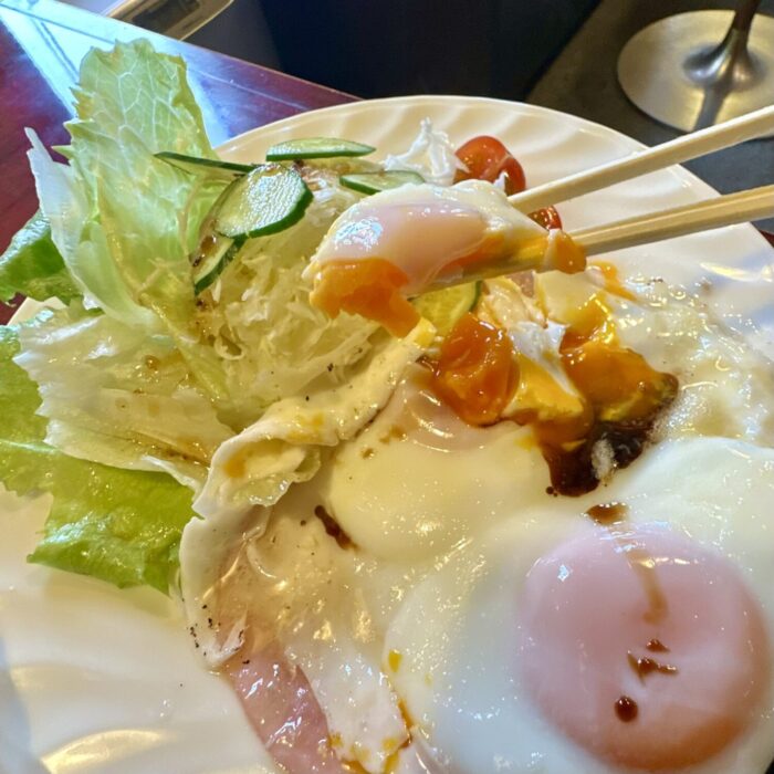 そしてこちらハイボールマンサイド、オツレサマに同じく朝スパゲティ不可に思考フリーズした結果のハムエッグ