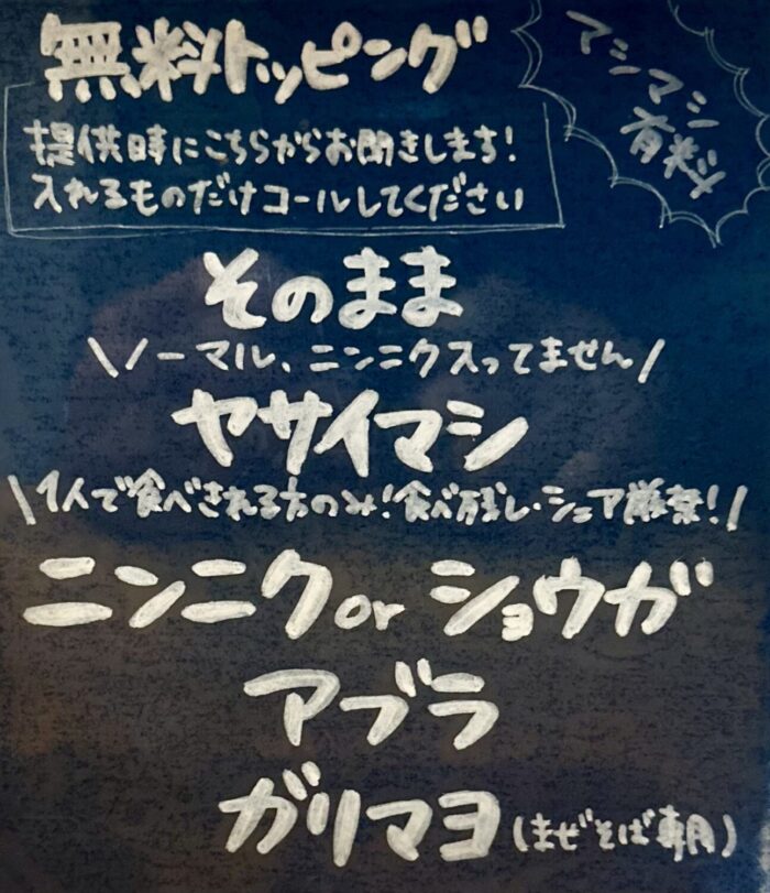 ありゃ、前はヤサイマシマシも有料トッピングのなかにあったんだけどなぁ、せっかくだからお遊び厳禁のヤサイマシマシいきたいなぁ、