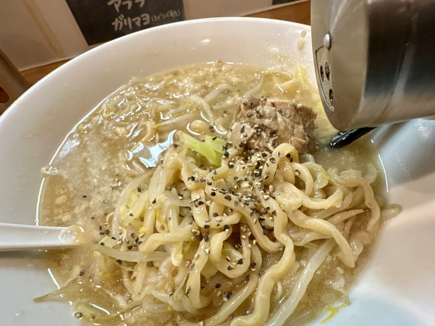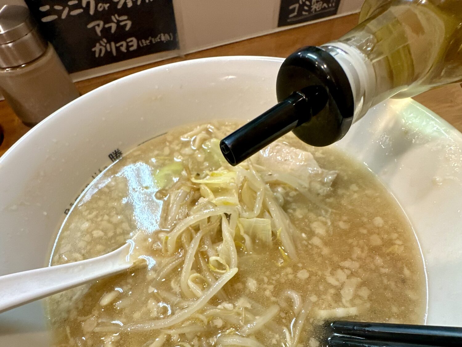 しばらくぶりに来たもんで、ちょこちょことした変更点に面食らいつつオーダー【ラーメン250g・ヤサイマシアブラニンニク】税込950円。