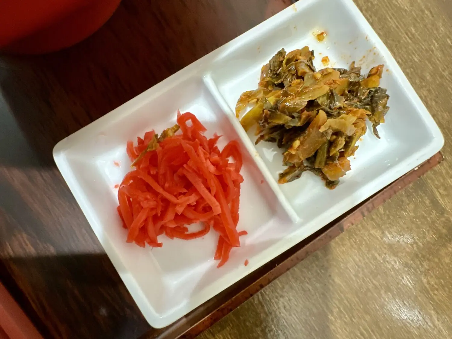 それに箸休め的に添えられる紅ショウガと辛高菜、そのまま喰うもよし丼に入れ溶かして味変的に使うもよし。