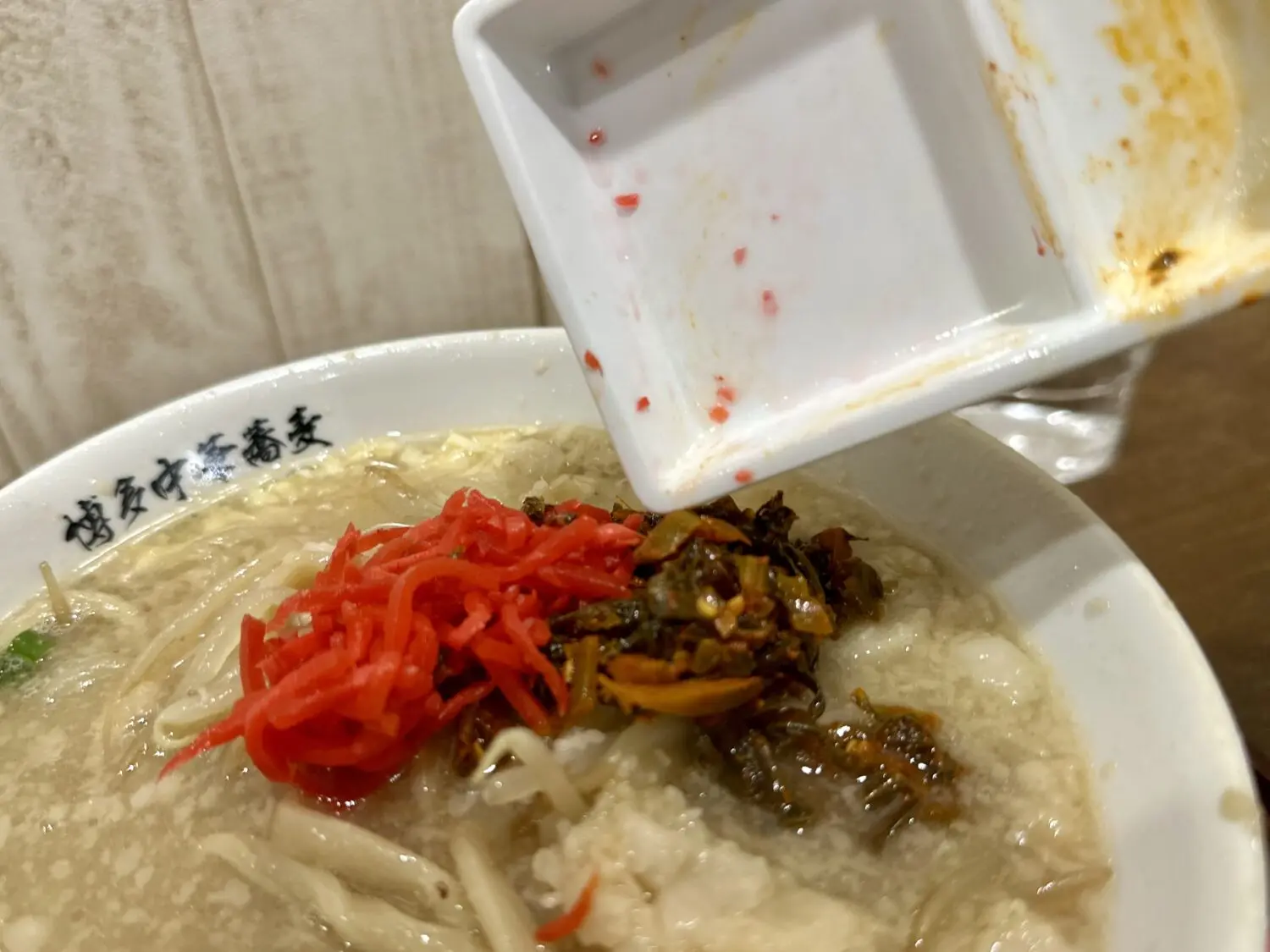 でもさすが店名に”博多中華”掲げるだけのことはある、黙ってても紅ショウガ&辛高菜が付いてくるヤマモリってなかなかない