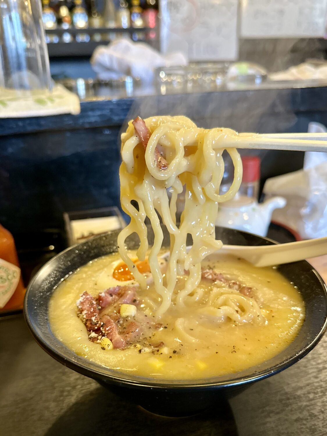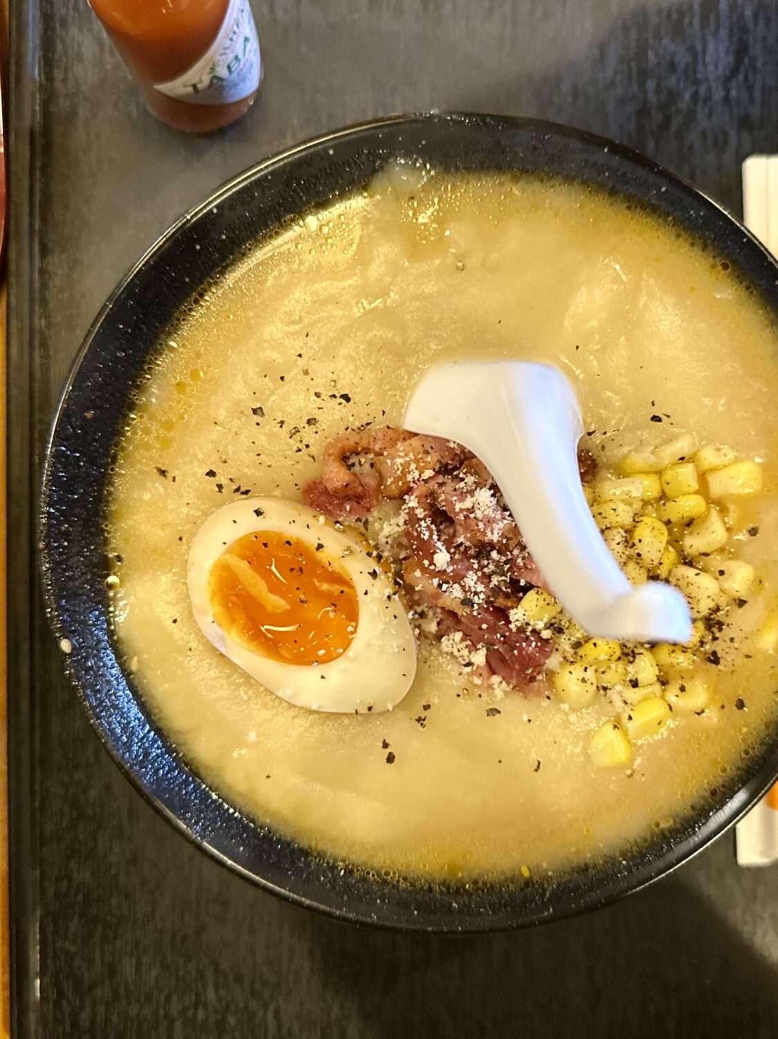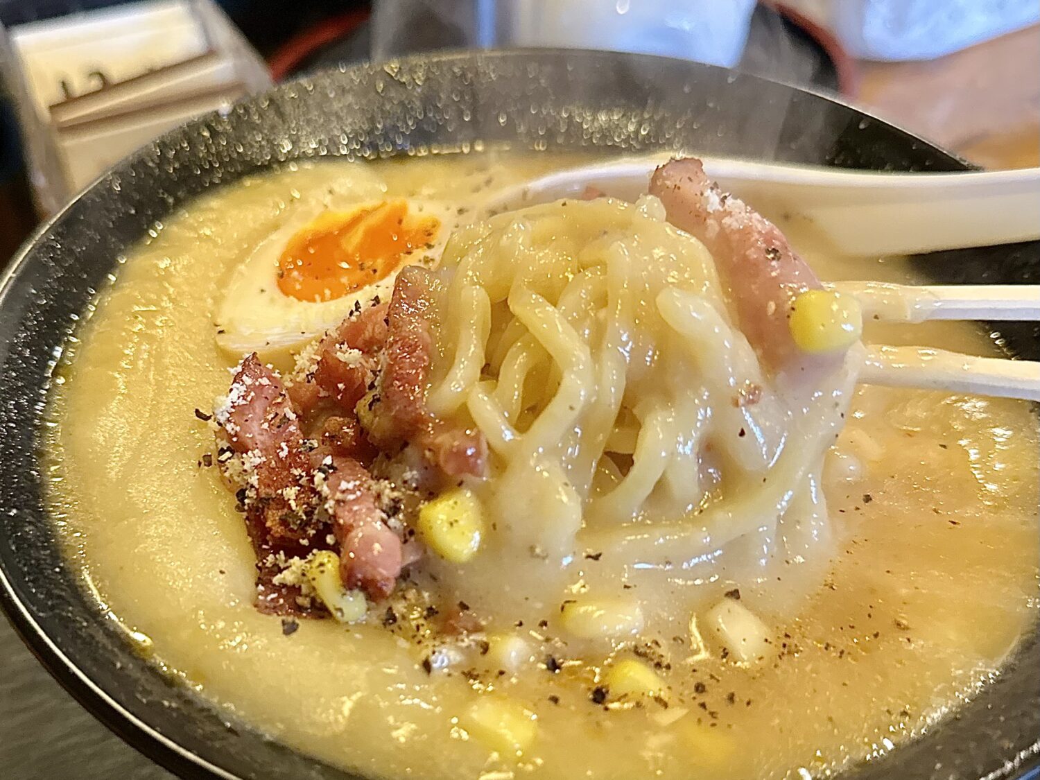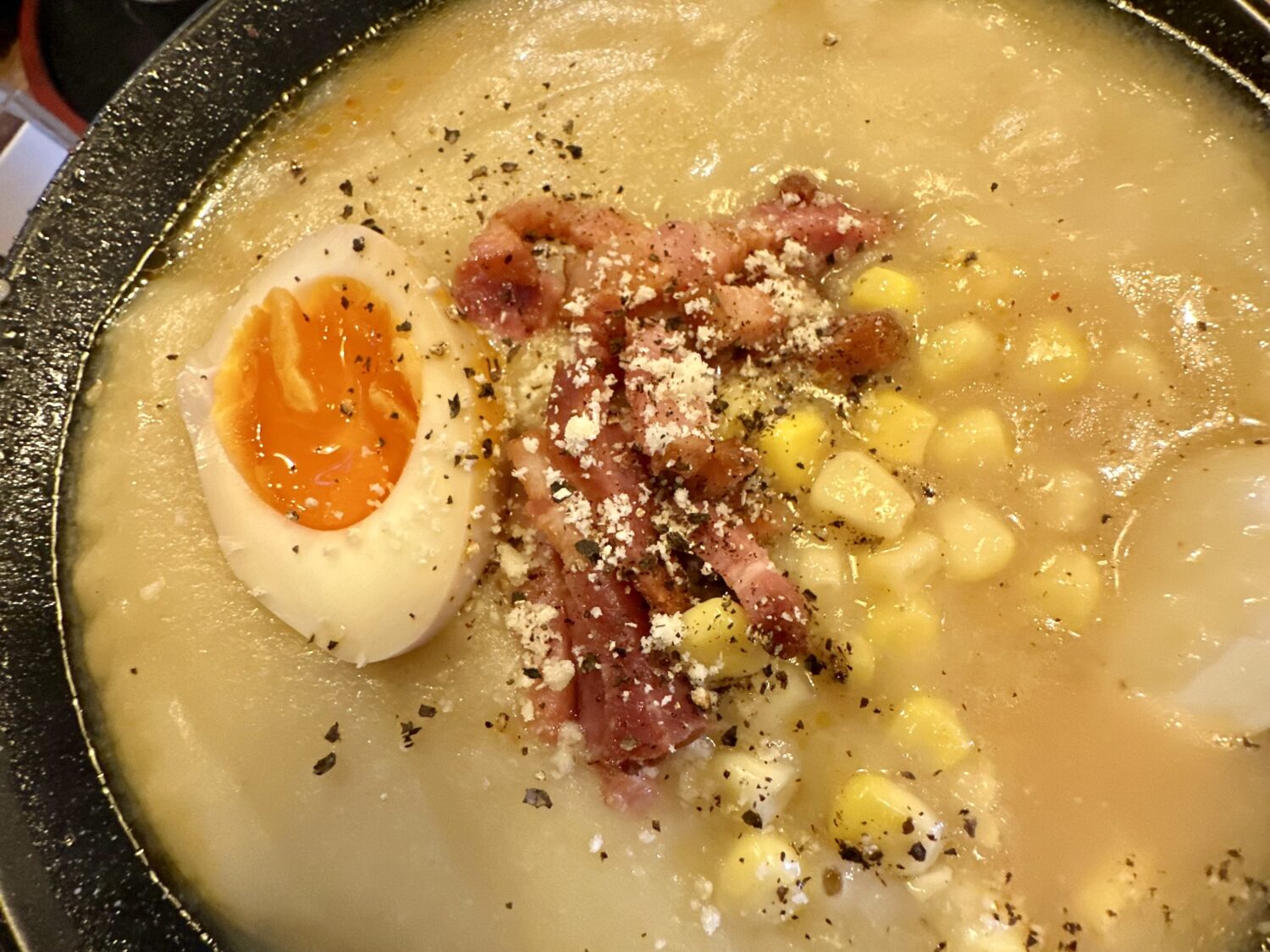 チャーシュー代わりのベーコンとキミ、もはやコーンポタージュの麺添え