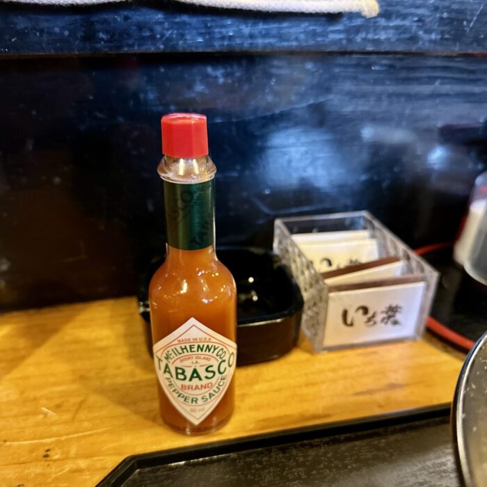 ここで味変タバスコタイム、もちろん常識の範囲内の量でまずは様子見ほどのちょぺらっと