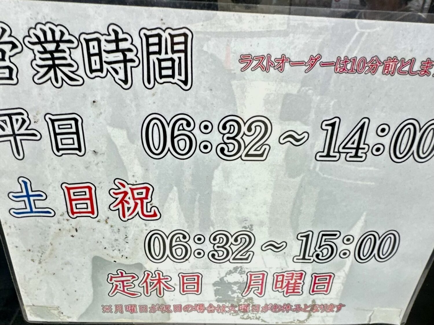 | 営業時間 | (平日)6:32〜14:00 (土日)6:32〜15:00 |