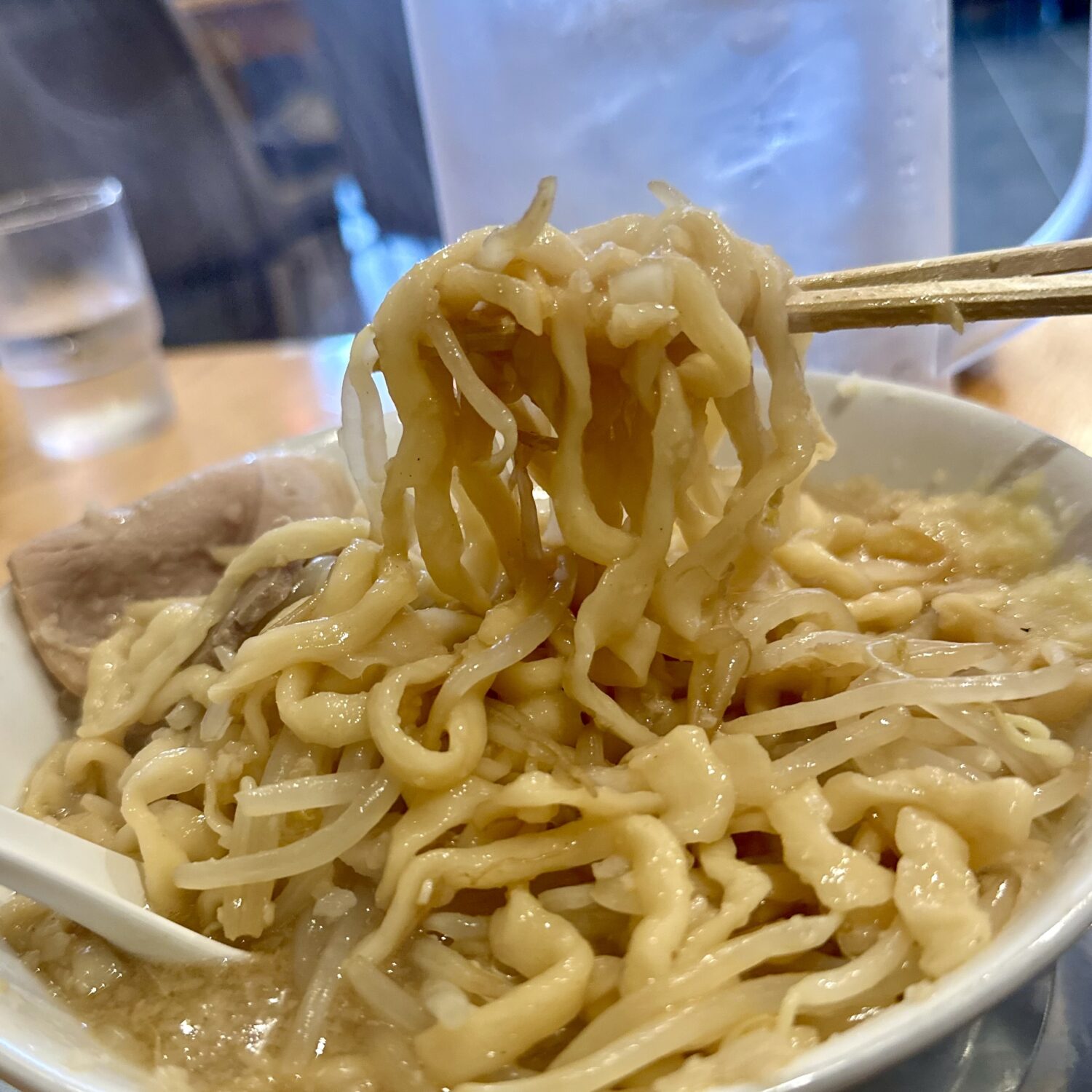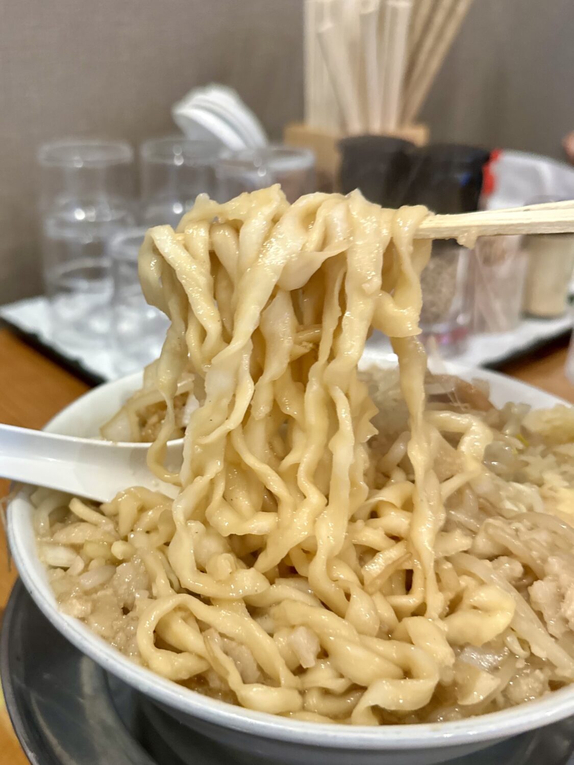 スープは濃口醤油な動物系に、時間の経過で多量セアブラがどんどん溶けて仕上がっていく仕組み。