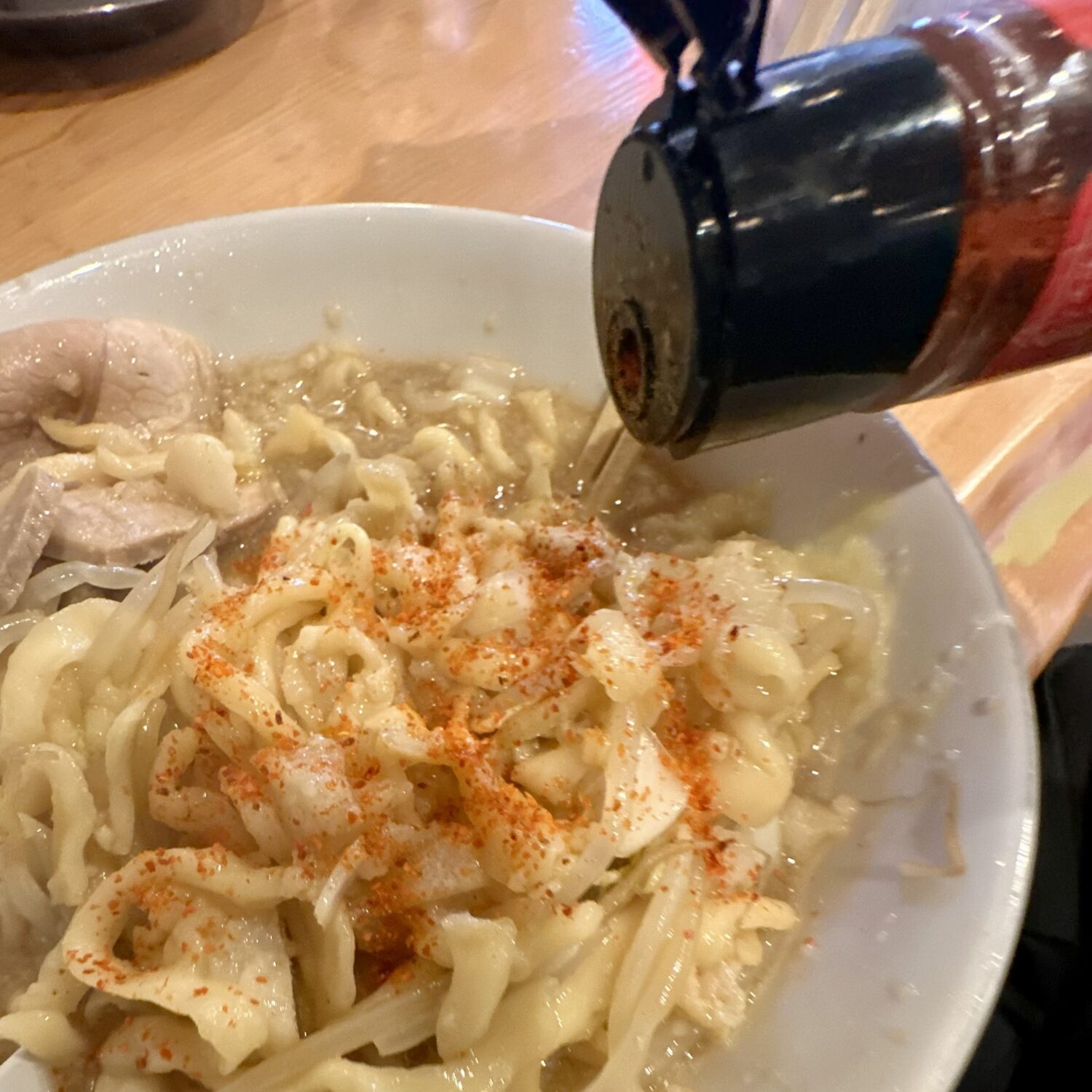 きっと大量のセアブラも気にならないように、っていうこの酢の要素、それをあえて薄めるべく調味料ダブル