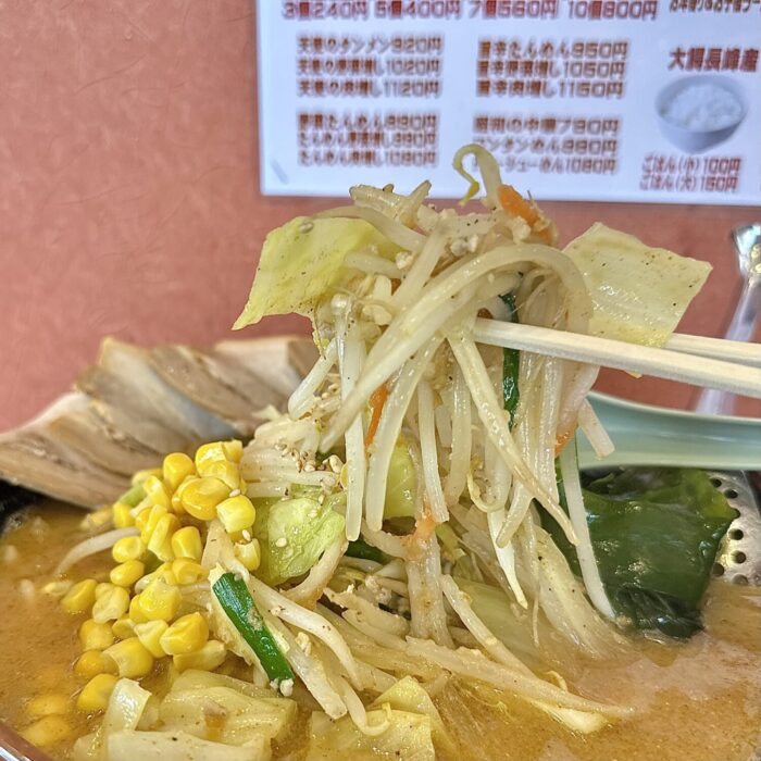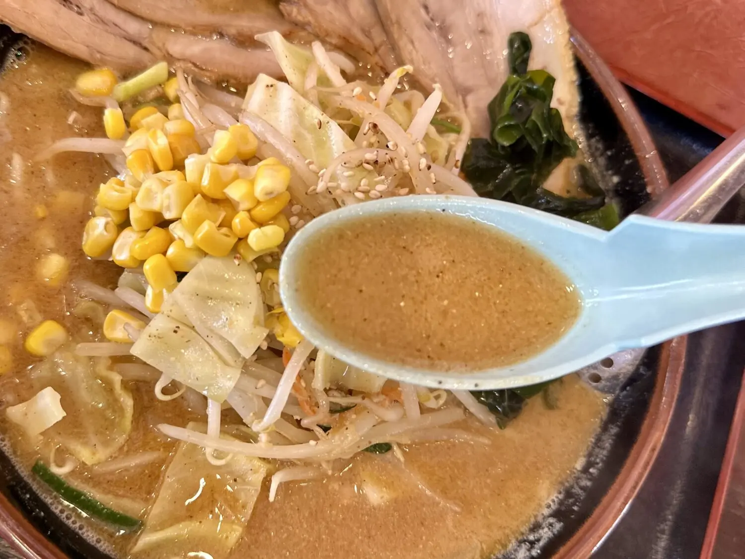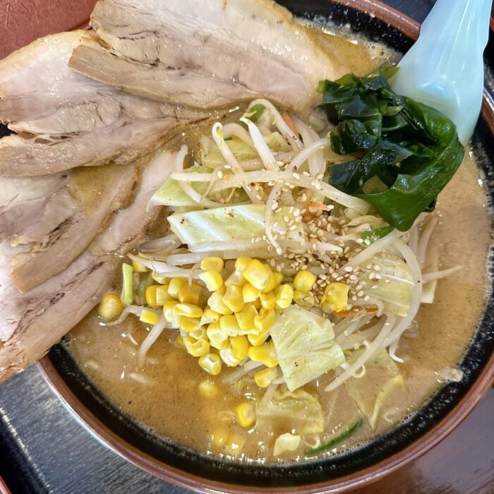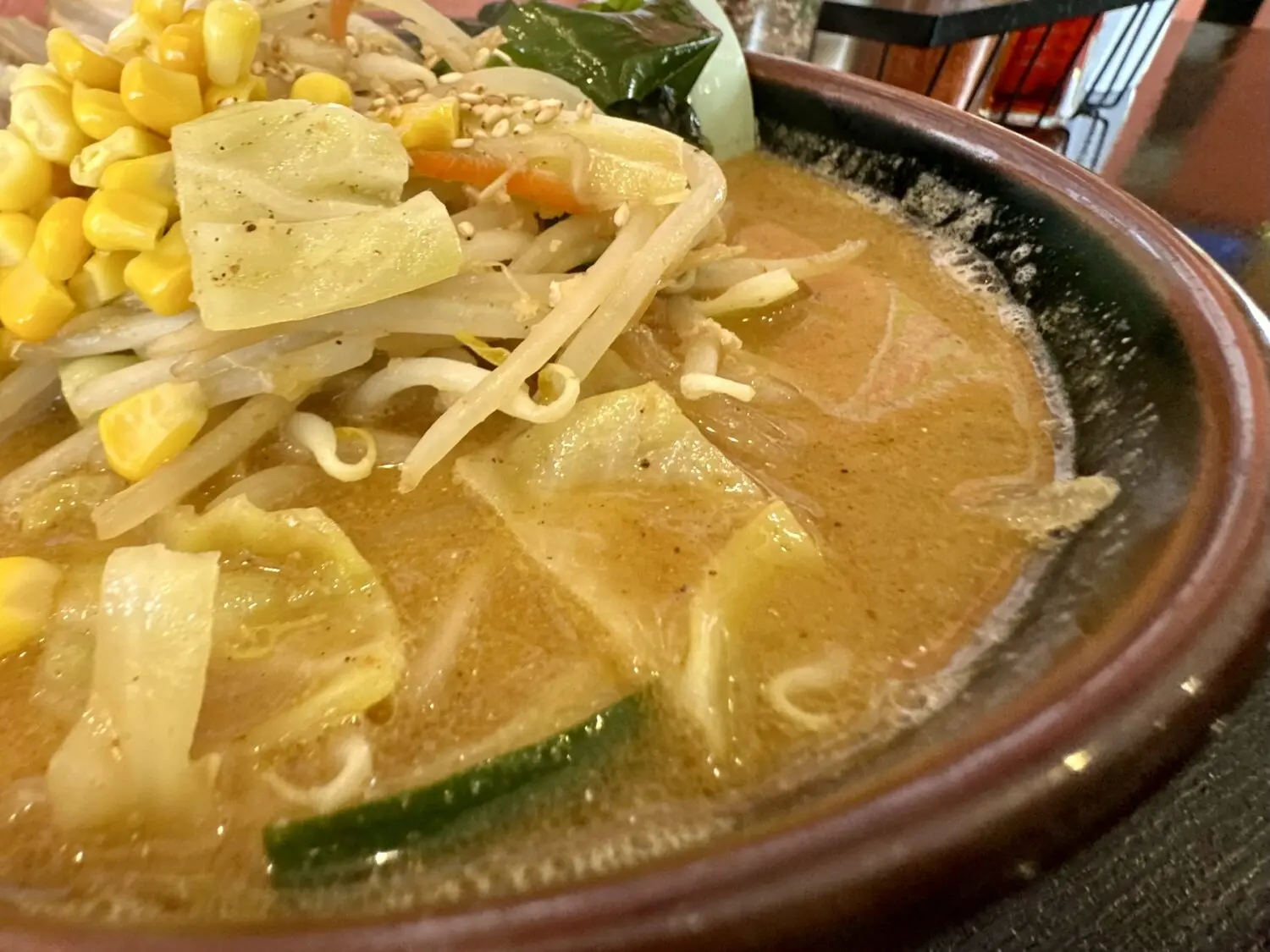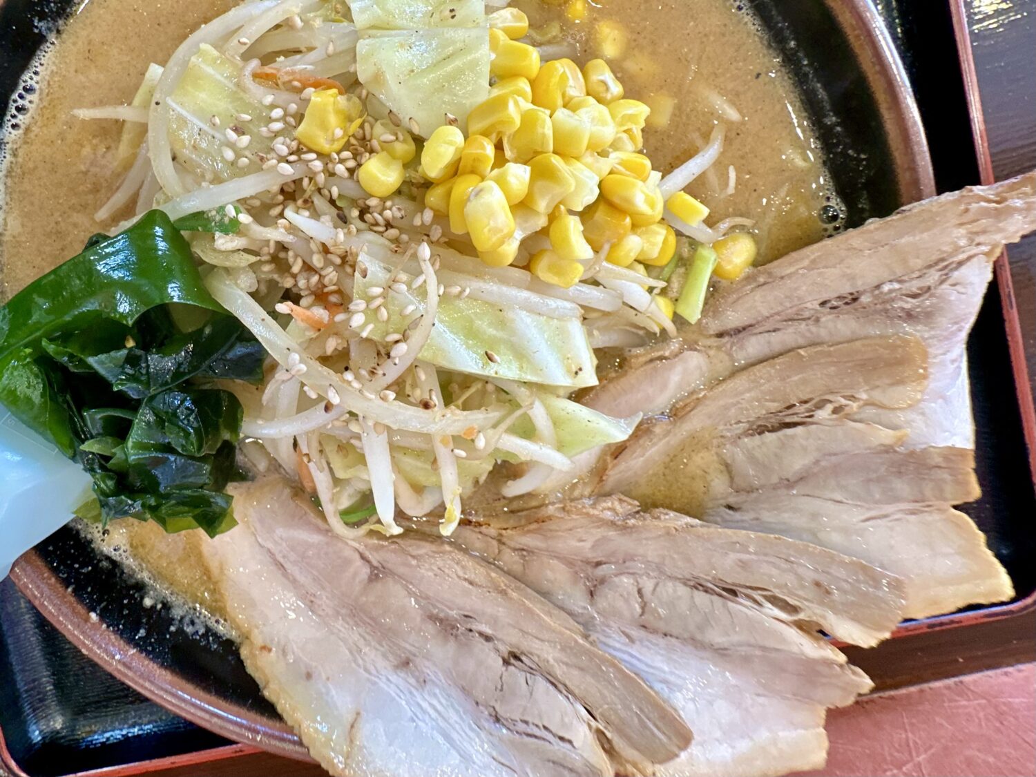 その他、デフォルト具材でワカメ玉ねぎモヤシにキャベツ、にんじんにニラにコーンに仕上げで白ゴマと、普通に豪華