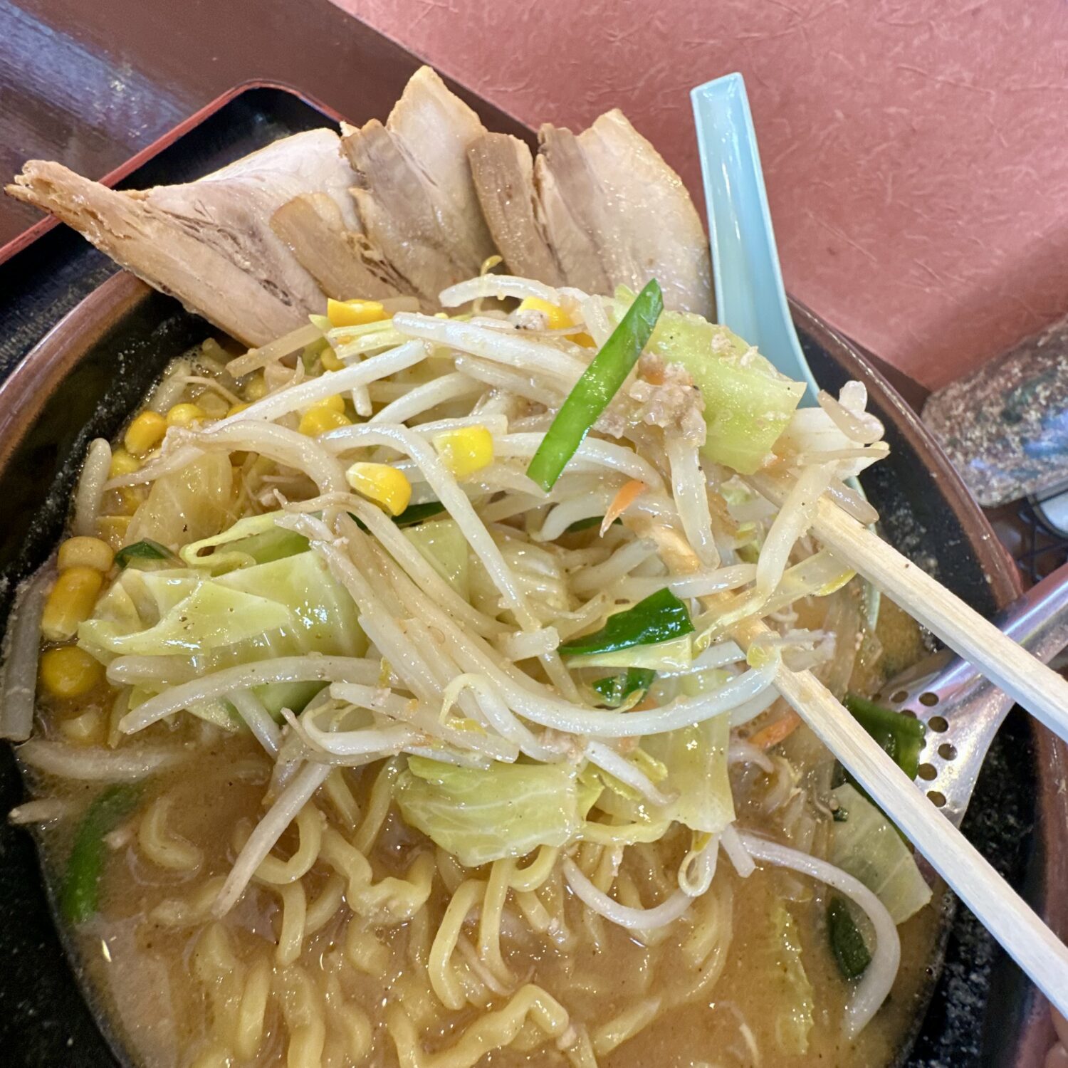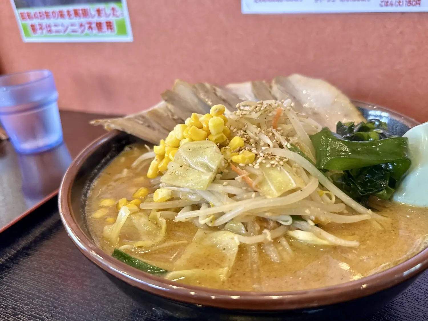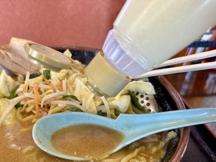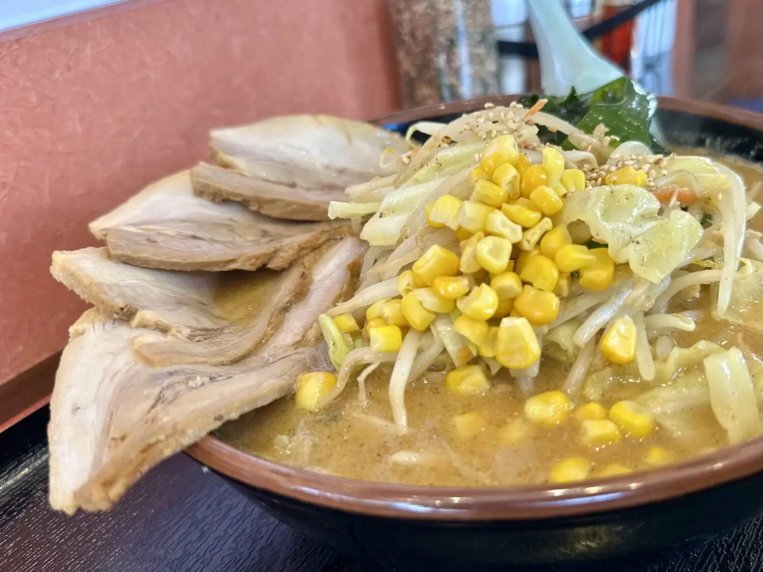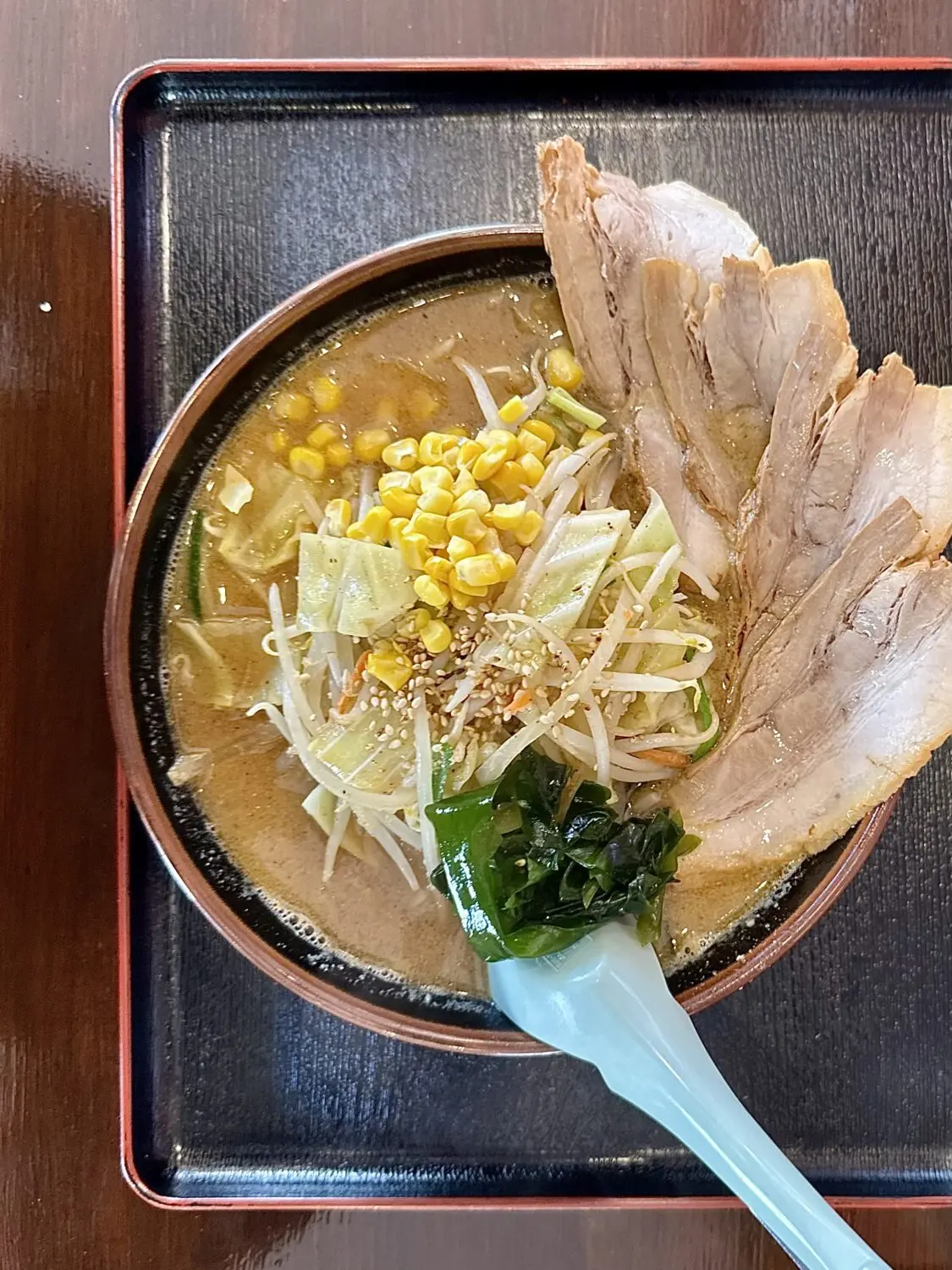 その他、デフォルト具材でワカメ玉ねぎモヤシにキャベツ、にんじんにニラにコーンに仕上げで白ゴマと、普通に豪華