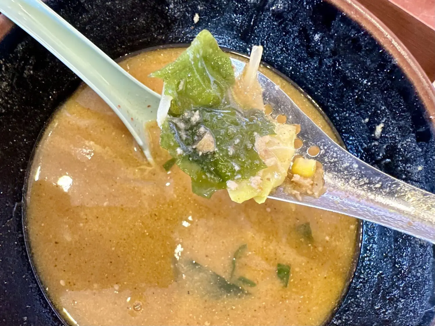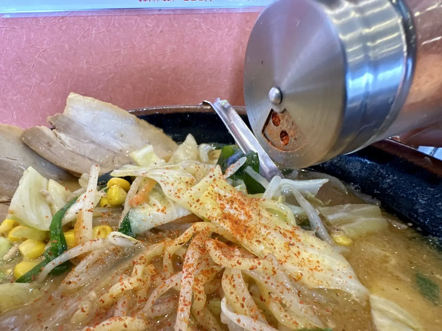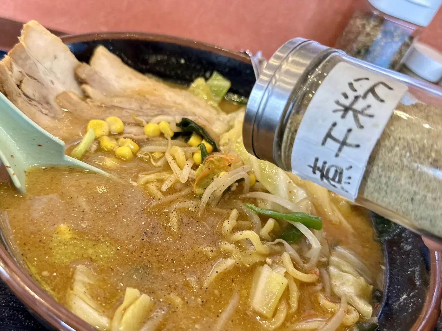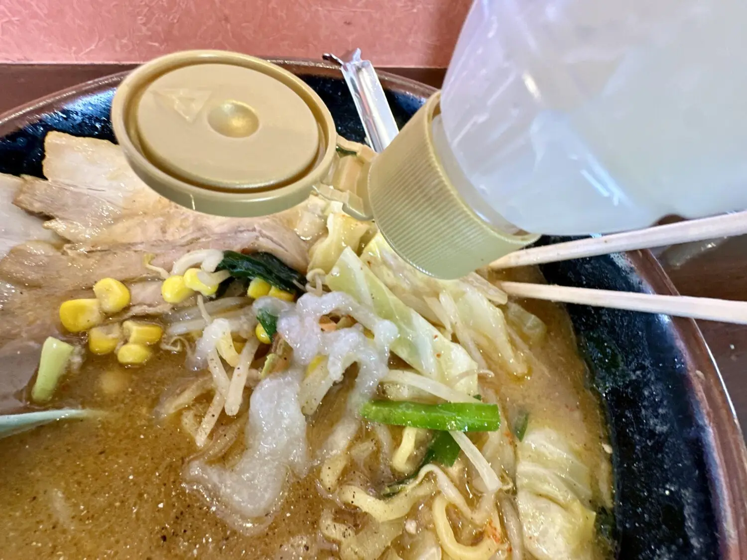 その他、デフォルト具材でワカメ玉ねぎモヤシにキャベツ、にんじんにニラにコーンに仕上げで白ゴマと、普通に豪華