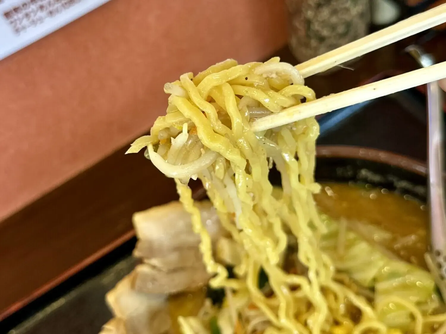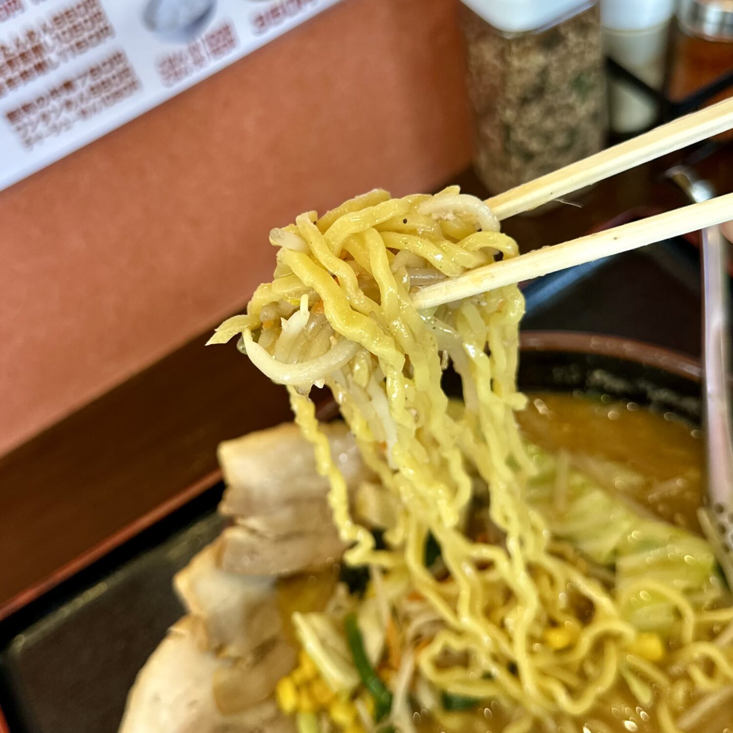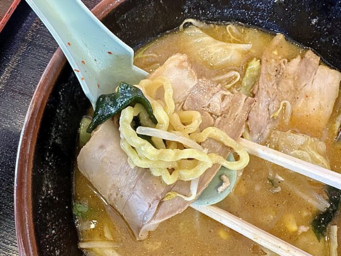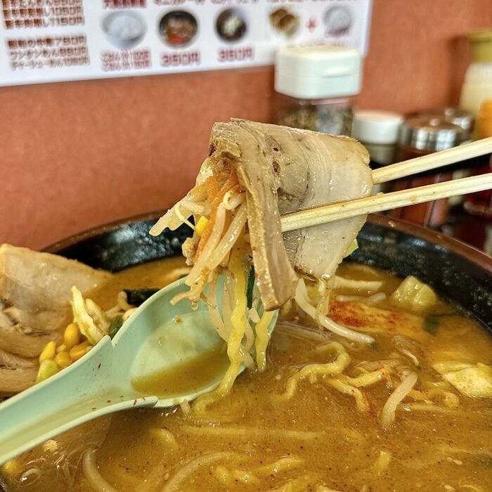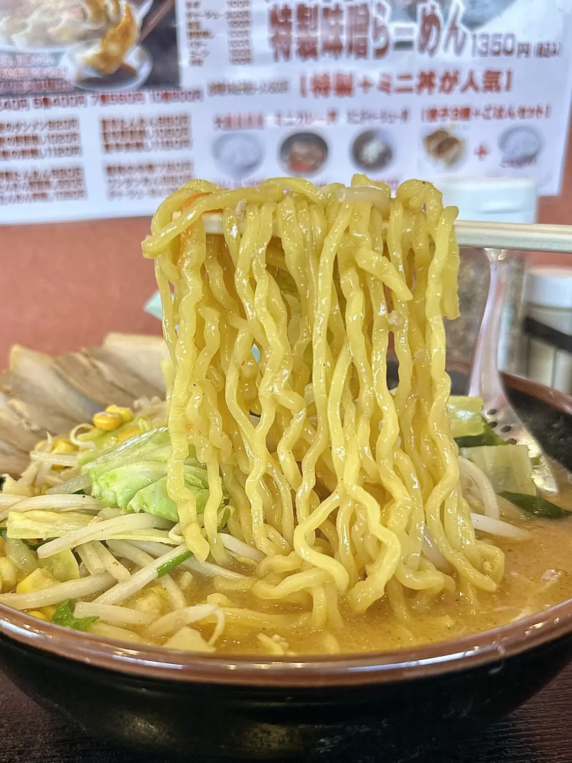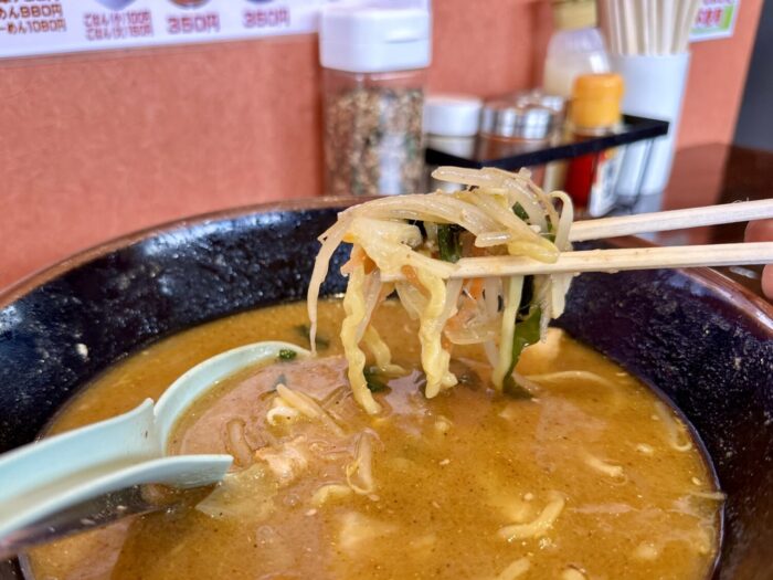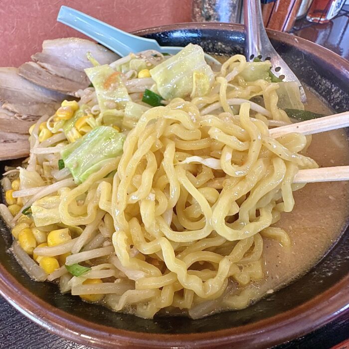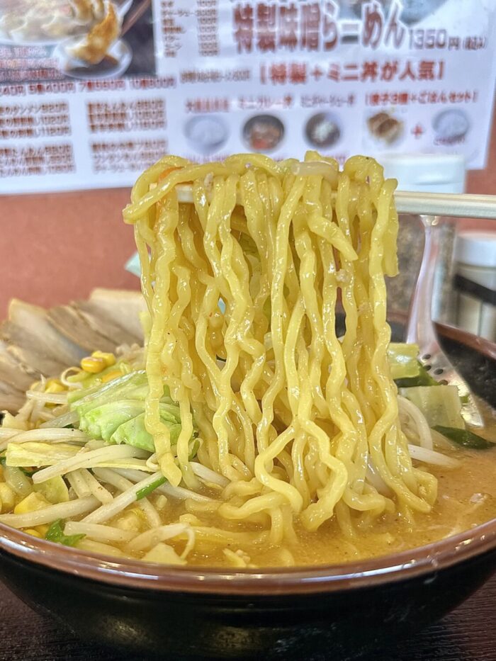 この麺が非常に美味い、いわゆるザ・札幌味噌の王道的な黄色ブリムチドゥンドゥルンの中太麺好きならアヘで死ぬ(థ公థ。)