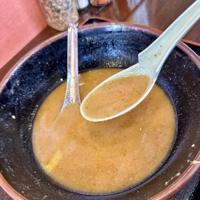 津軽味噌に赤と白の信州味噌をブレンドしたものを樽熟成で5日間、さらにニンニク生姜にリンゴやホタテエキス等々っていうスープ。