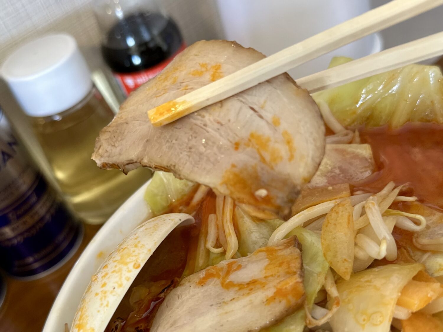 そんな良き良きムーブの中にあって唯一ちょい寂しいのがチャーシューのペラッ感、スープ熱で溶けた脂身部分から自然と二つに分かれるレベル
