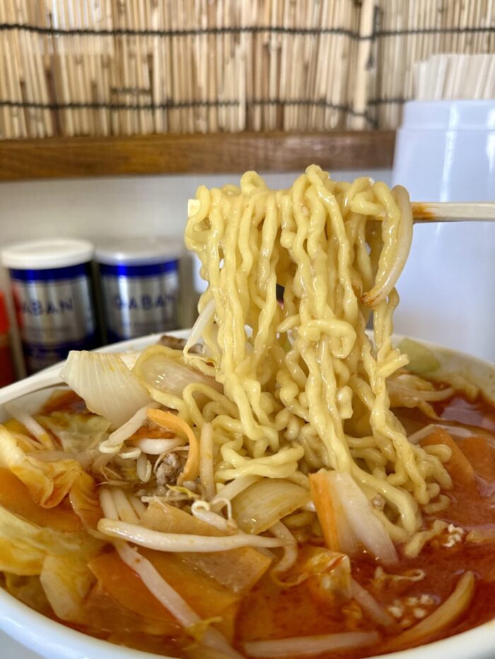 ドンブリ底から引っ張り出した中太麺、ムッチモチムチな食感見えててこれまた良き