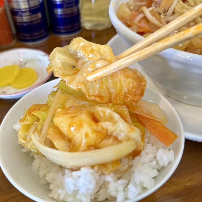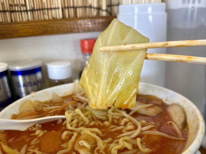 デカ切りカットのキャベツ、食べ応えの良さと引き換えに芯のフィーリングだったり口の周りギッタベッタになるけどそれも良き。