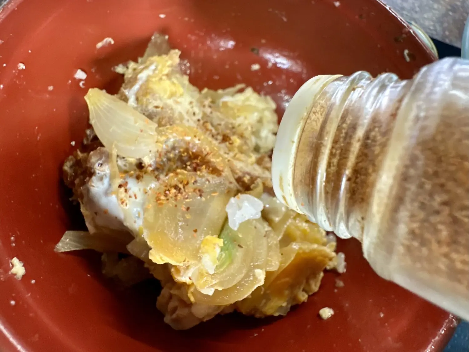 対するかつ丼サイドには一味唐辛子、オリエンタルな風を感じつつのガブムシャゴックンがたまらない