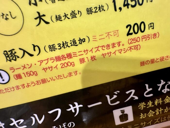 小ラーメンから250円OFFで提供のミニサイズ、麺量もヤサイも少ない上に通常1枚乗ってくるブタも1枚っていう登竜門