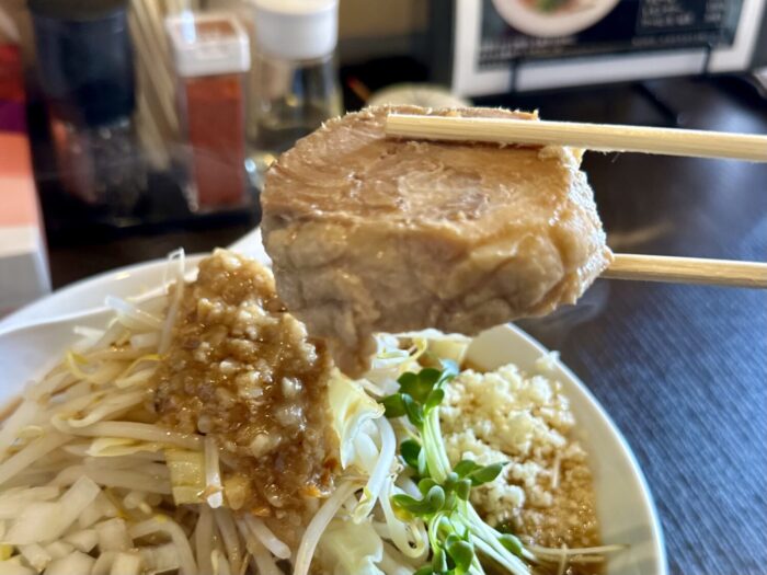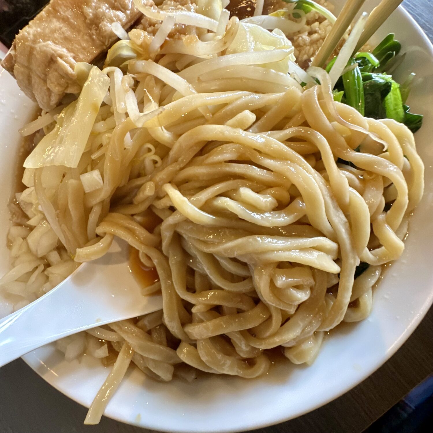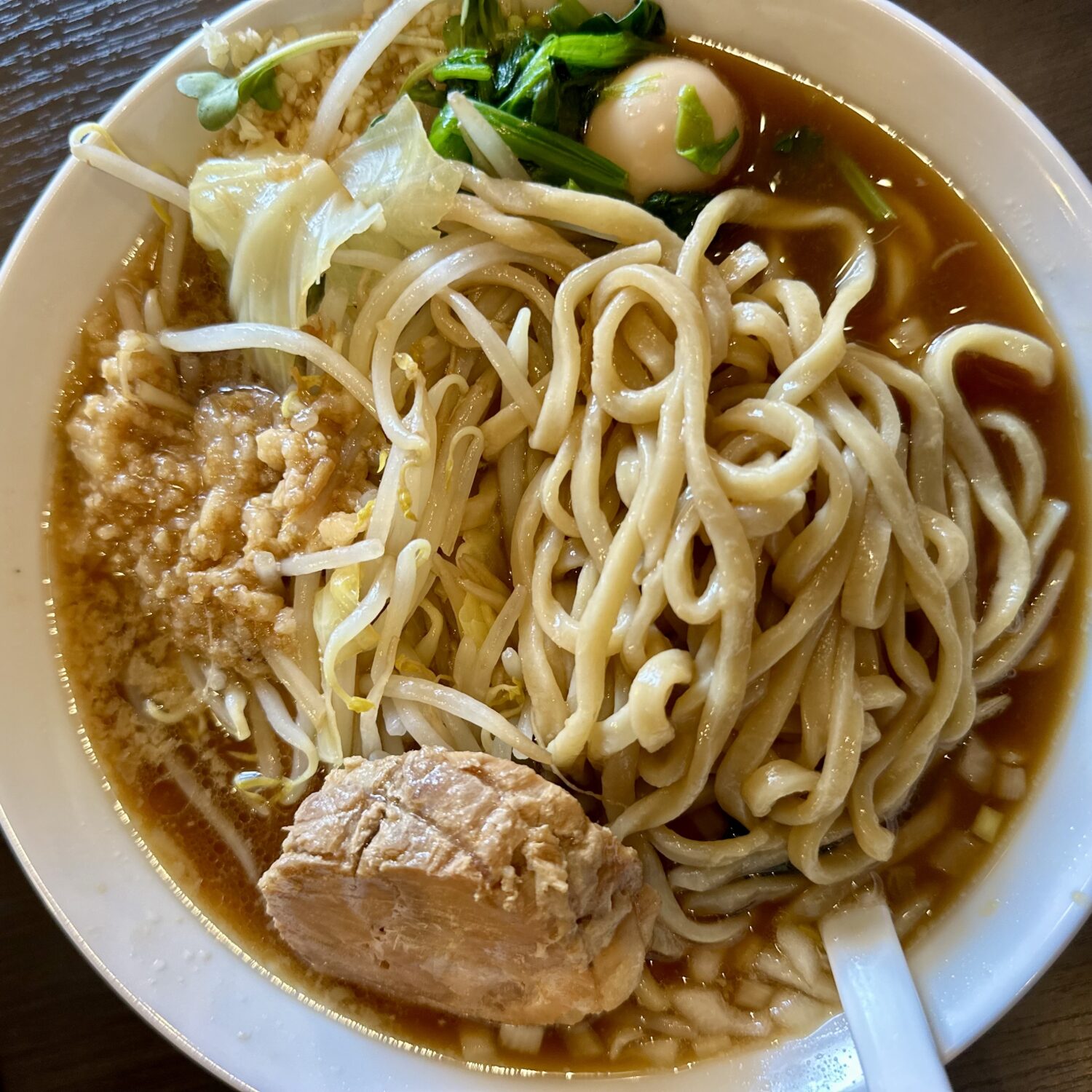 マシマシ野菜の迫力は正直それほど、けど麺にスープに極厚ブタにザクタマにウズタマ、緑野菜に、それらトータルでみたバランスの良さが光る一杯。