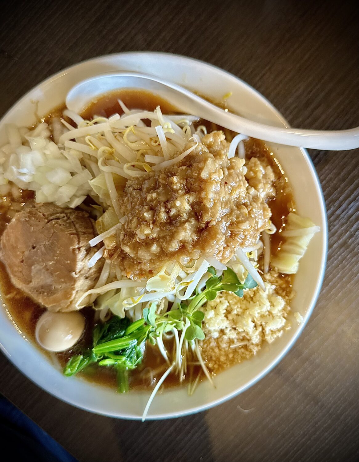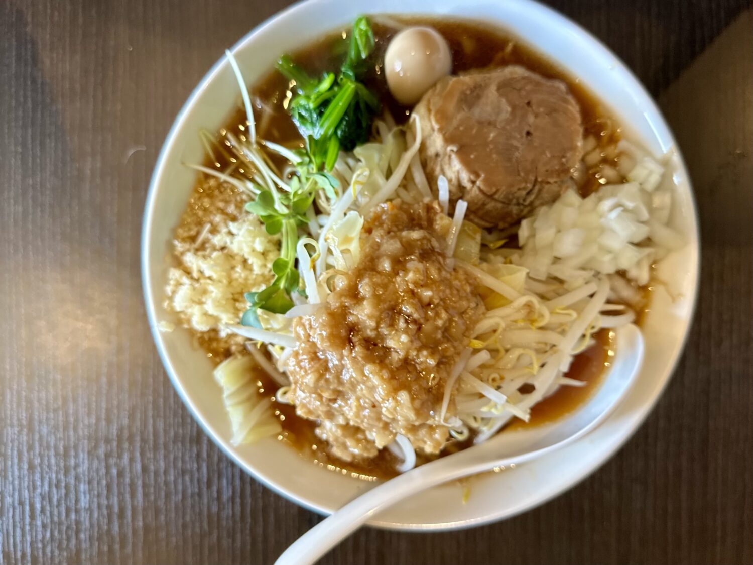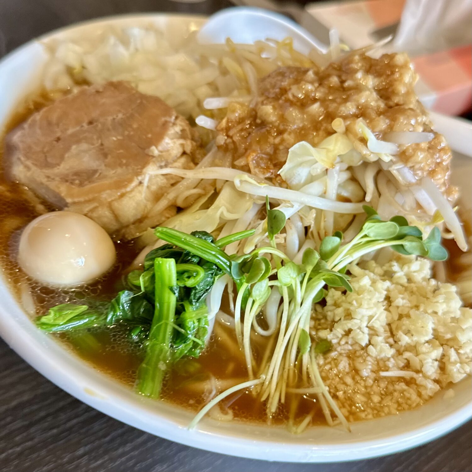 マシマシ野菜の迫力は正直それほど、けど麺にスープに極厚ブタにザクタマにウズタマ、緑野菜に、それらトータルでみたバランスの良さが光る一杯。