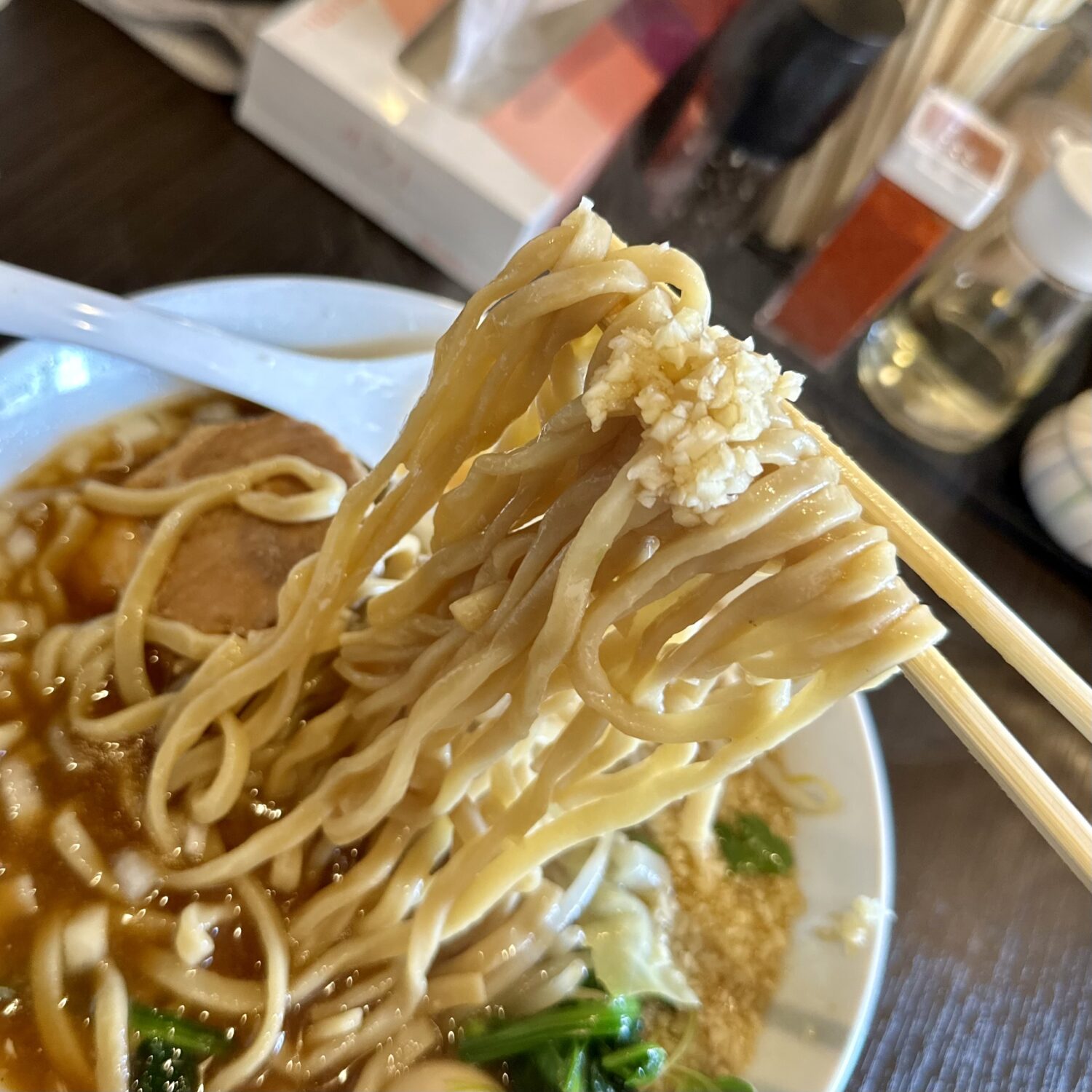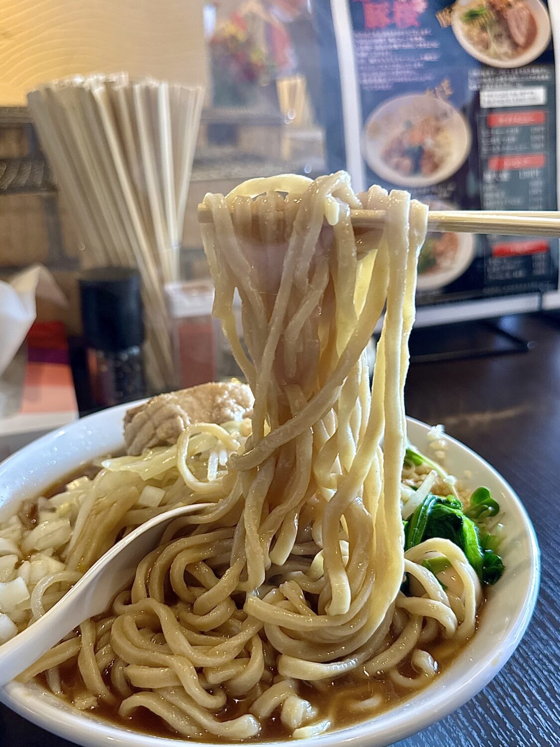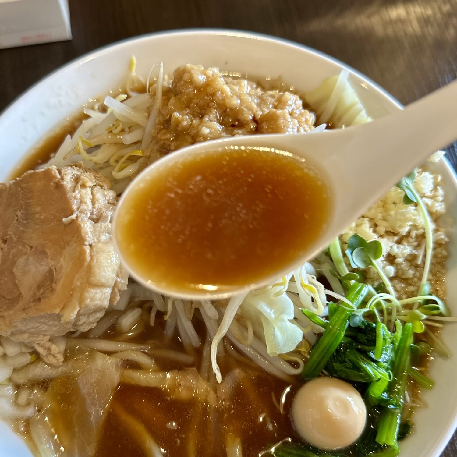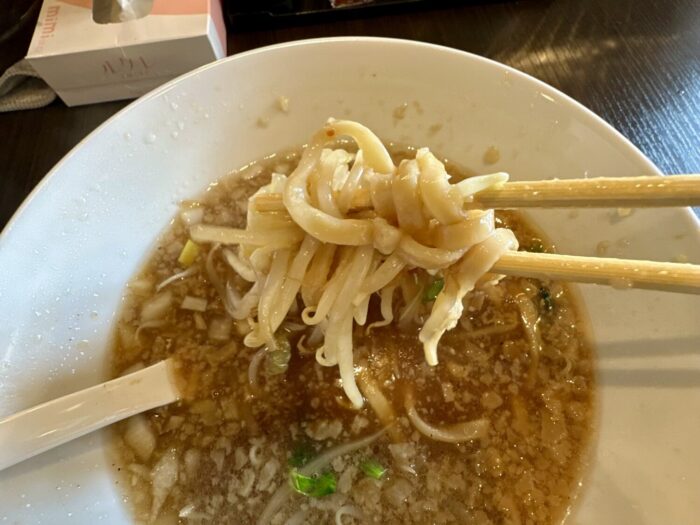 スープは非乳化タイプのスッキリタイプ、甘めのカエシと長時間炊いて作ったという豚エキスの旨味で甘シャープな飲み口