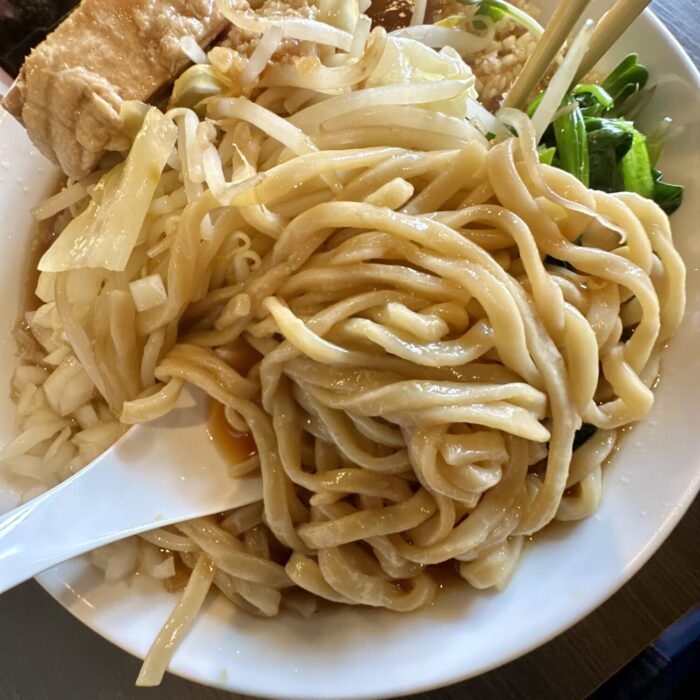 ときどき見かける、”本格二郎ッッッ!”とか謳っときながらただのツルツルチュルチュルの多加水中太麺とは一線画す、ムッチリしつつもザラを感じさせる逸品麺。
