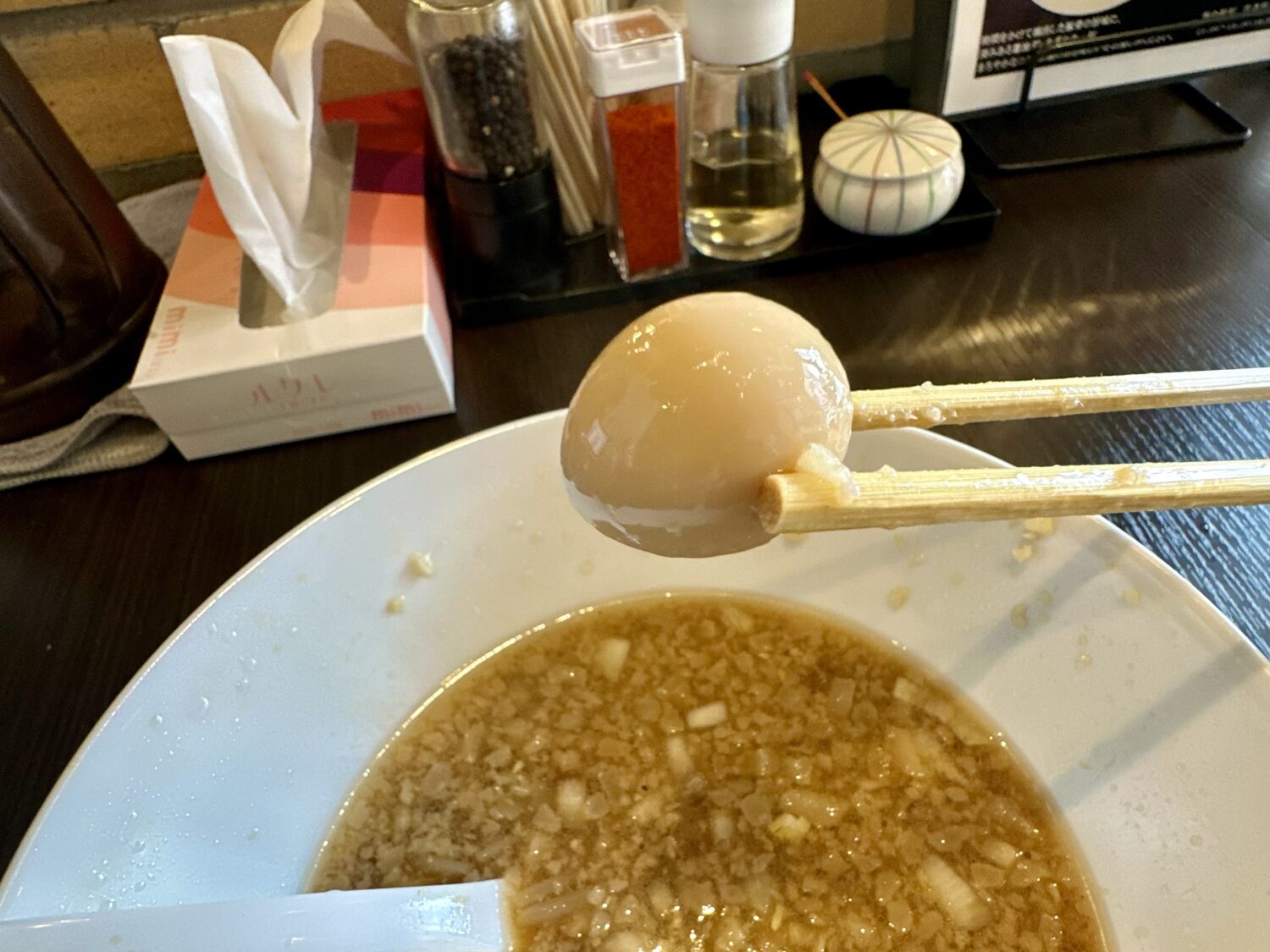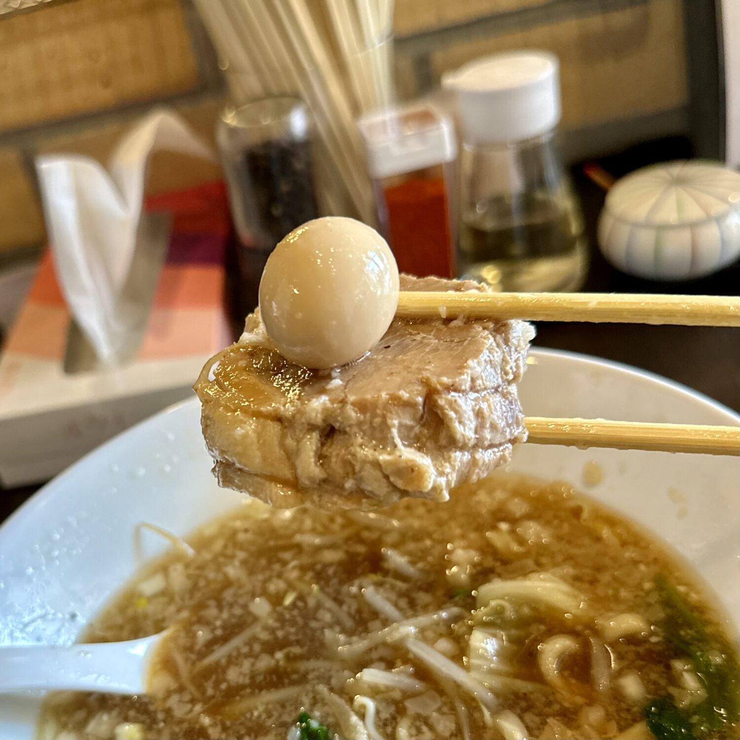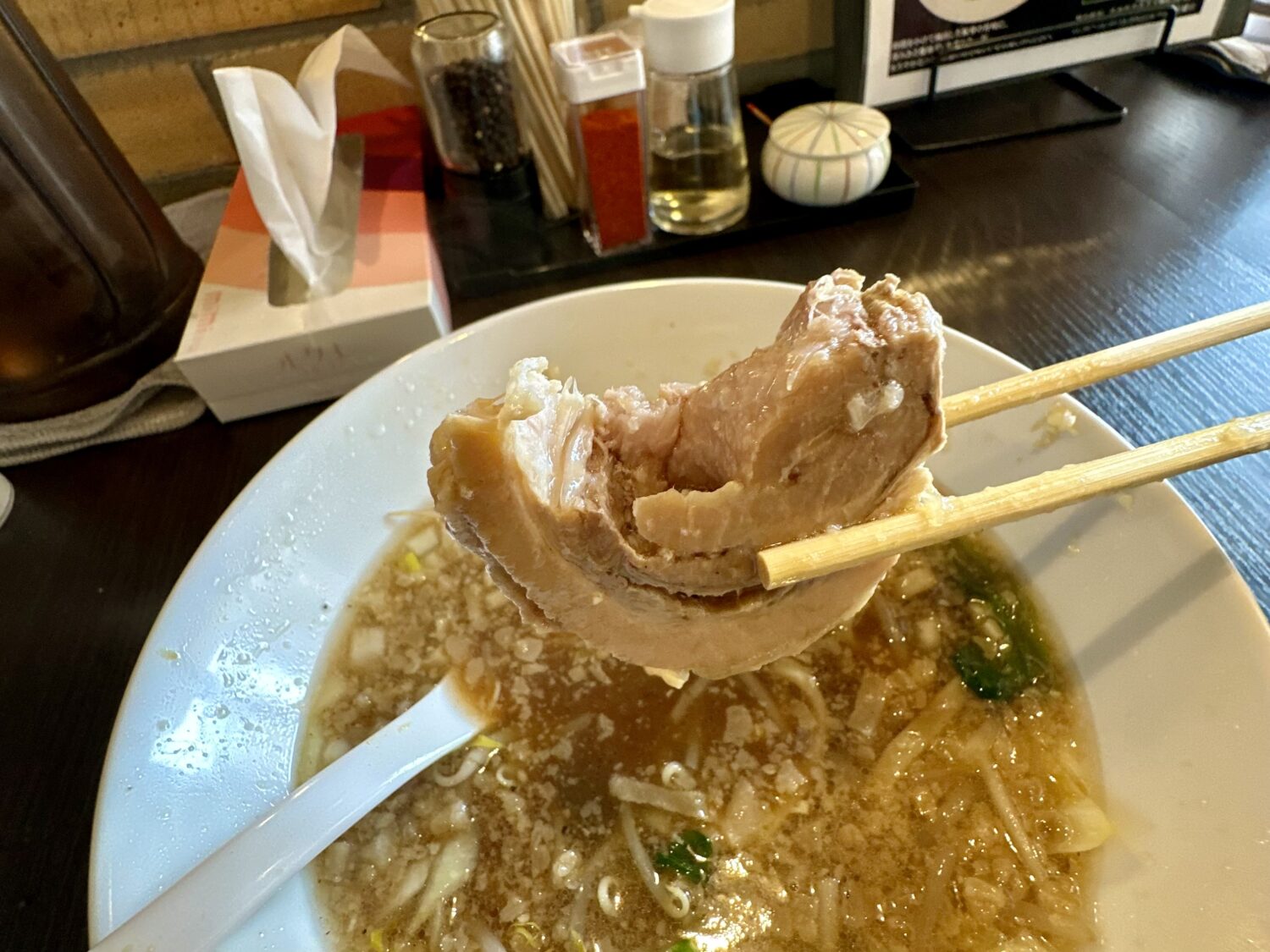 スープは非乳化タイプのスッキリタイプ、甘めのカエシと長時間炊きの豚エキスの旨味はきっとムッサい男のみならず、キレイでキツめの女性でも好きなやづ。