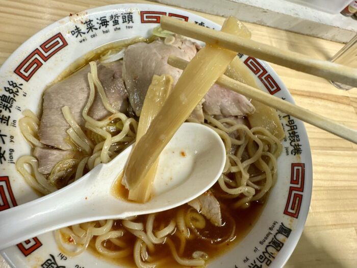 デフォルトの乗せ具としてはチャーシューのほか、ネギとメンマだけっていうシンプルさも眩しく光る