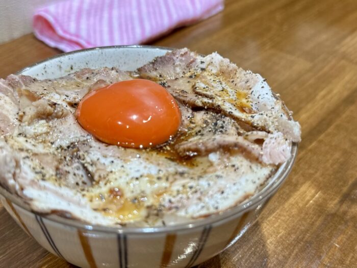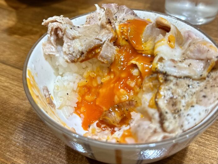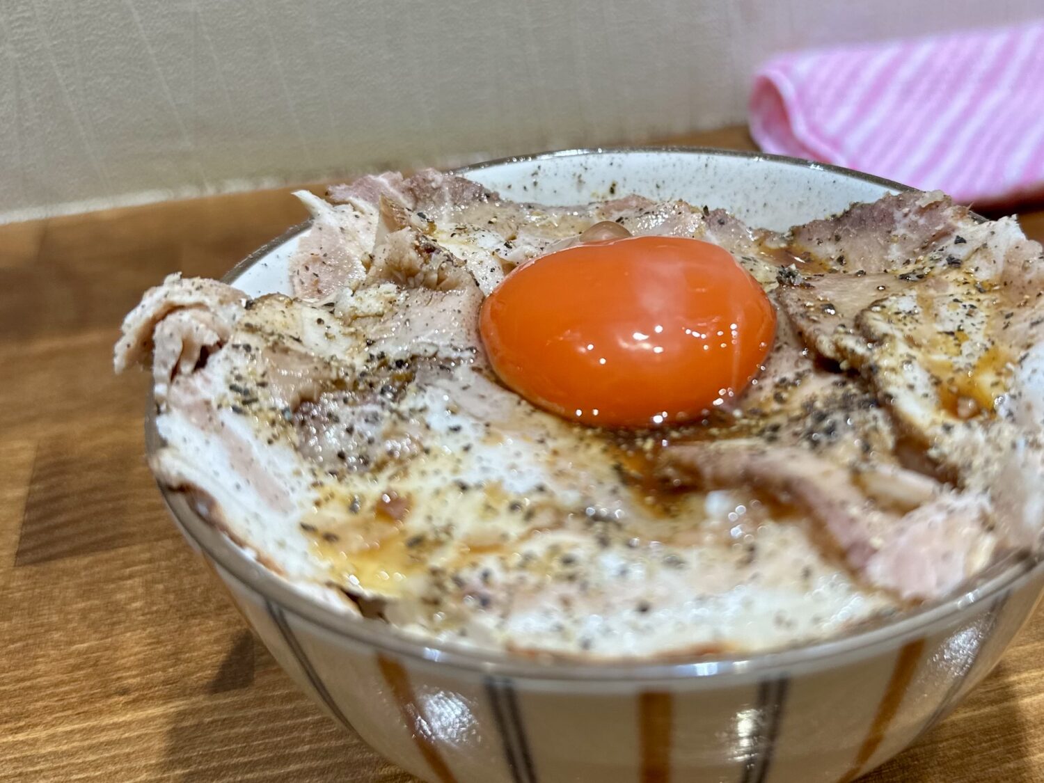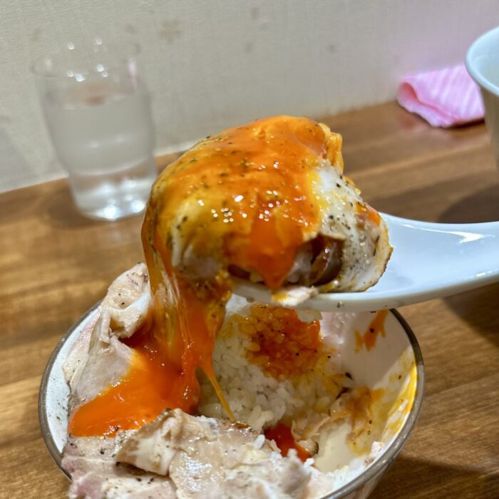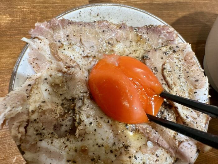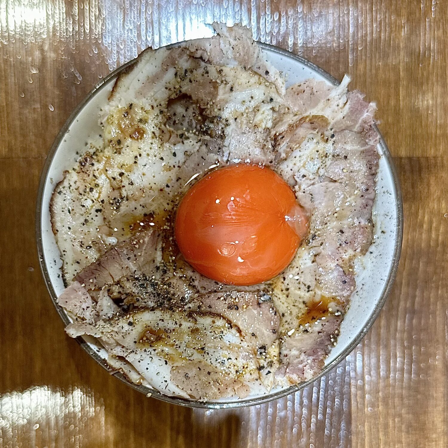 ペラスライスの豚チャーシューにブラペ振ってタレかけて、仕上げに卵黄落としてるとかもう完全に強すぎる