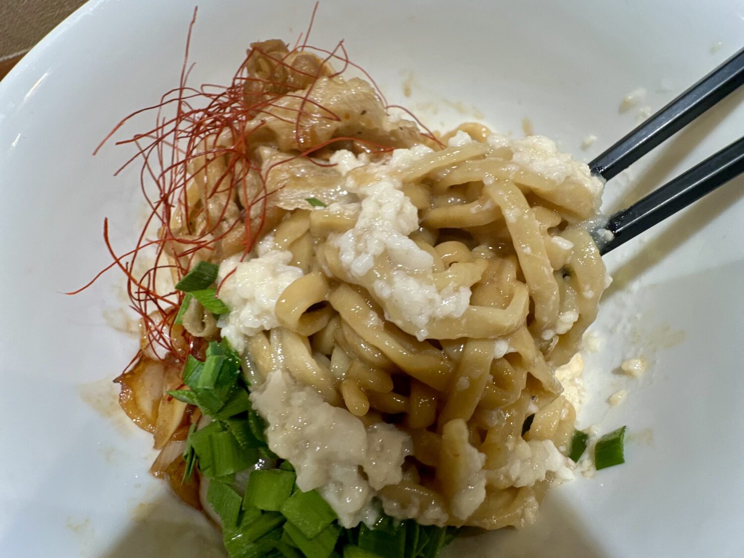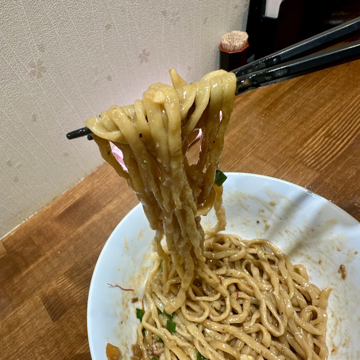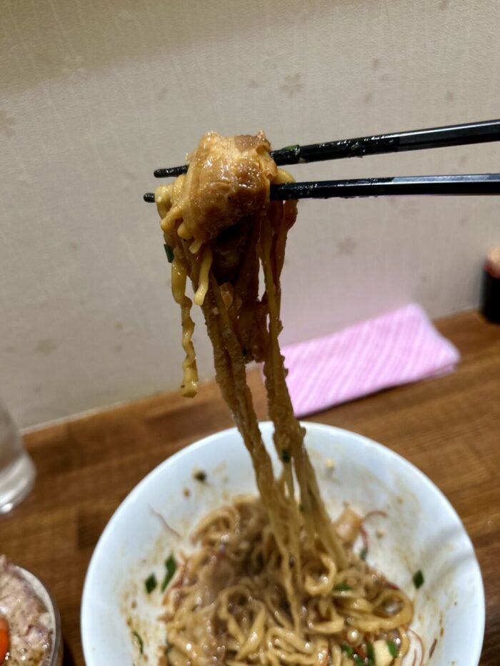 べダラッ&ヌルラッの平ちぢれ麺を具材と一緒にまーぜまぜ、からのズルヌルガブムシャゴックンキュン。