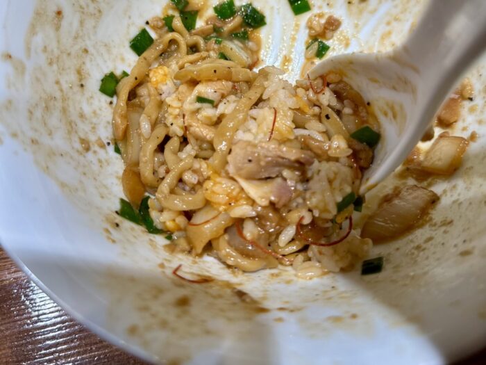 ふた口分ぐらい残しておいた豚ごはんをマゼソバの器に全投入、からのグッチャグッチャの本気混ぜ