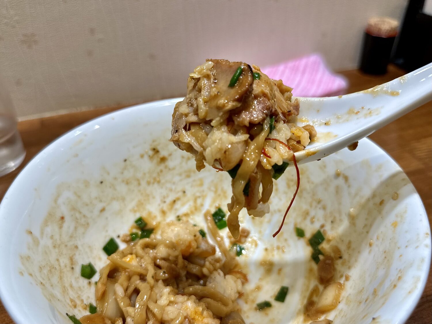 濃いめの味付けに絡むニンニクと背脂の芳醇フレイバー、食欲と背徳感がせめぎ合う中でも止まらない箸持つ手に口から続く消化器系。