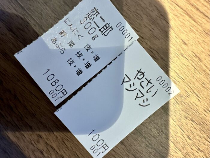 次来ることあるなら麺カタメの400g、加えてマシマシ券×3のマシマシマシマシマツマシに、ってあれっ、ツが一つだけ隠れているよ(。→ˇ艸←)