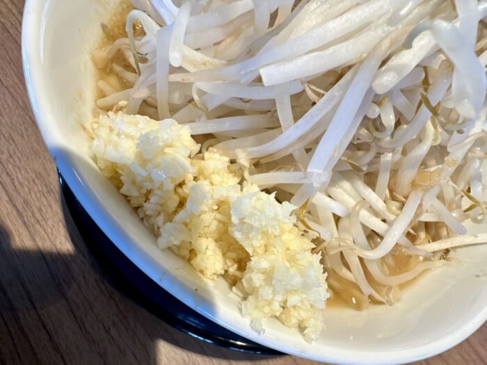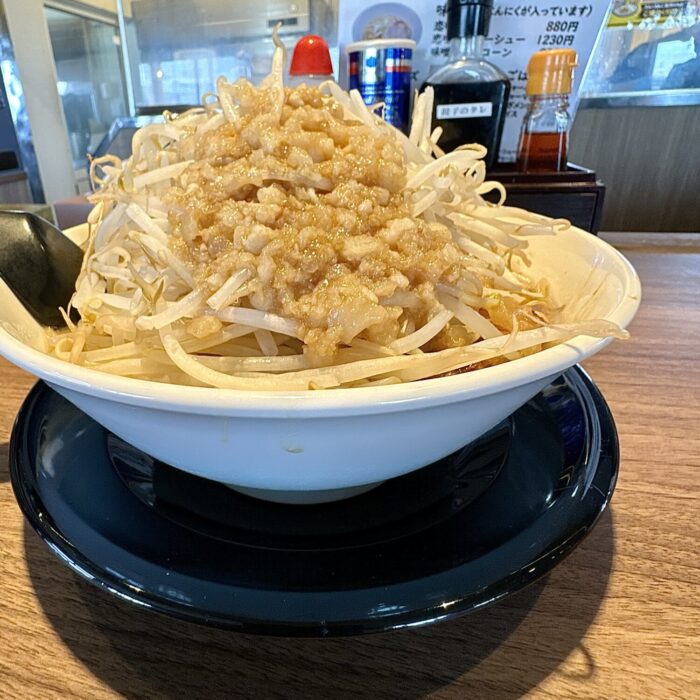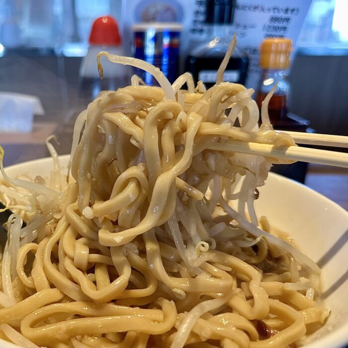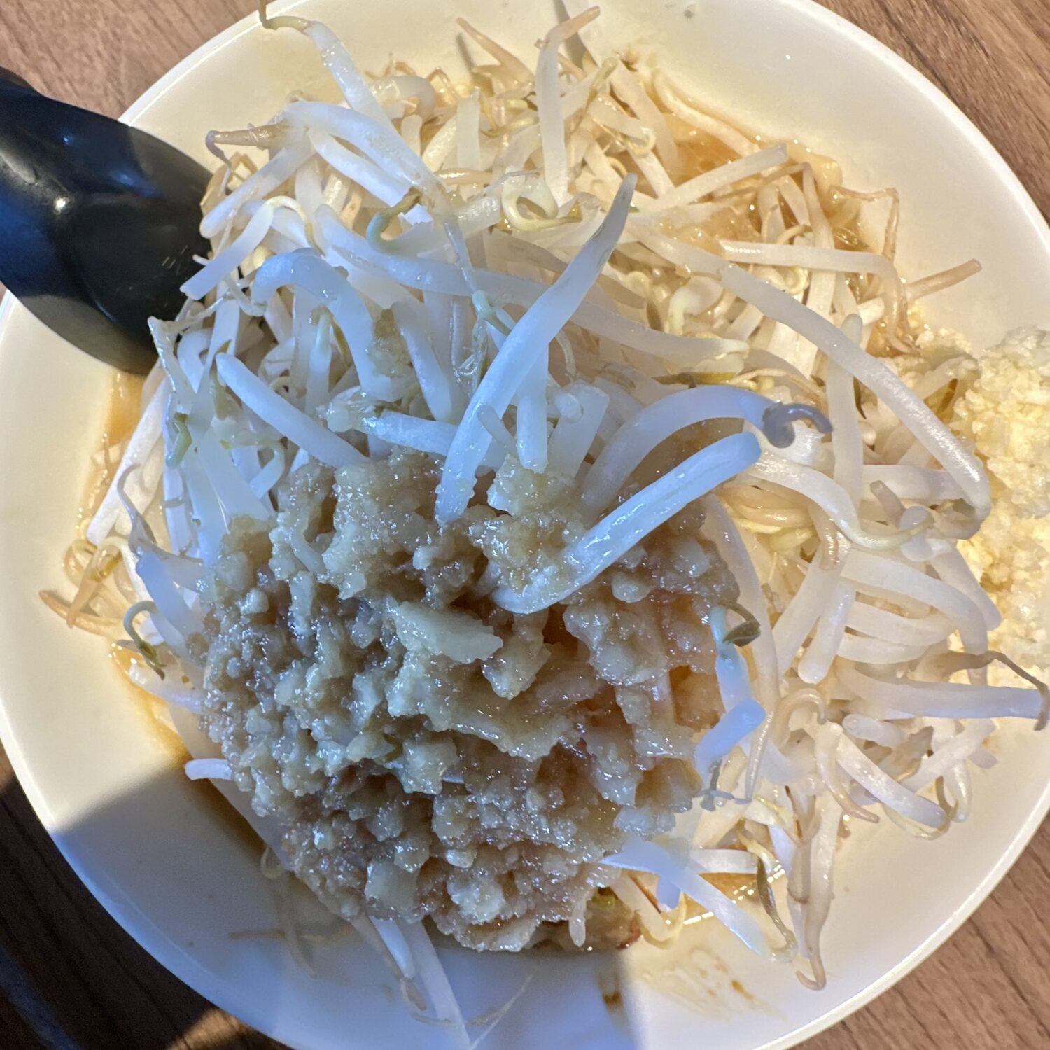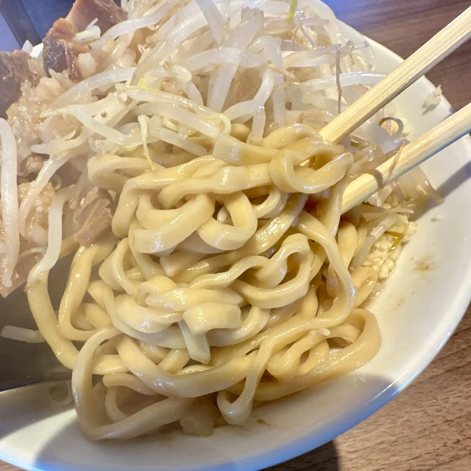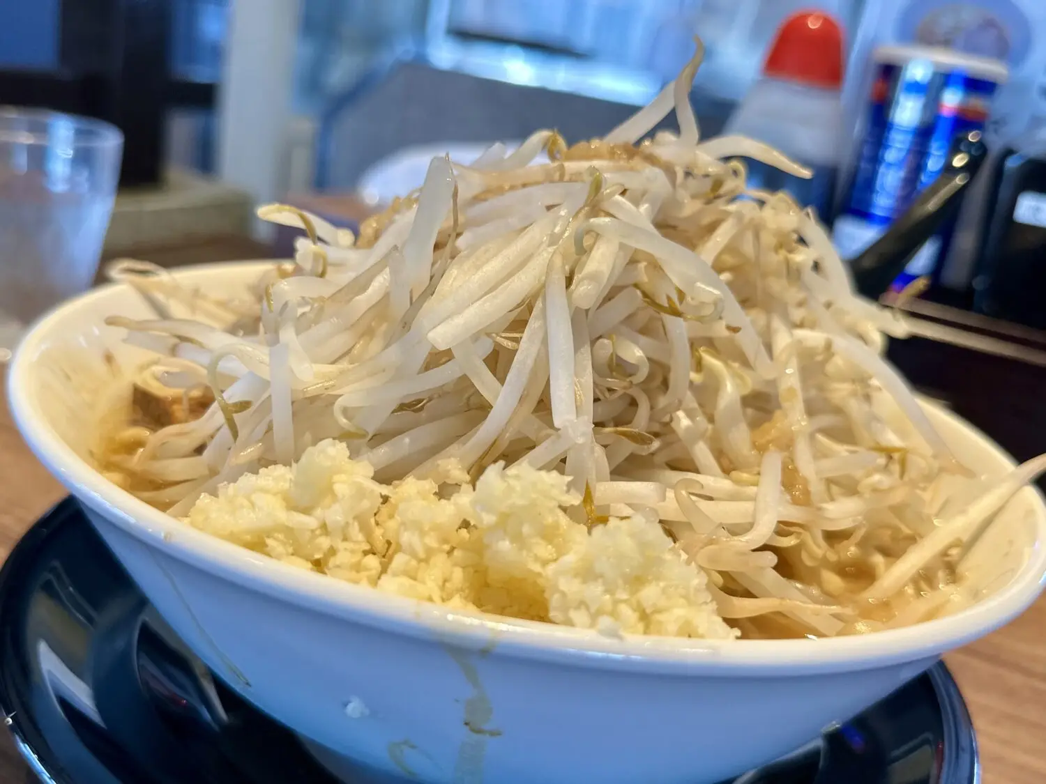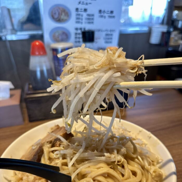 老若男女に楽しんで欲しい、と言わんばかりのジャンク度抑えめな控えめソフトなスープに”二郎”らしさっぽい平打ち太麺、そしてモヤシの茹でガマリが鼻くすぐる大量ヤサイ。
