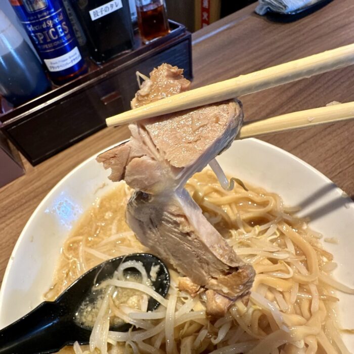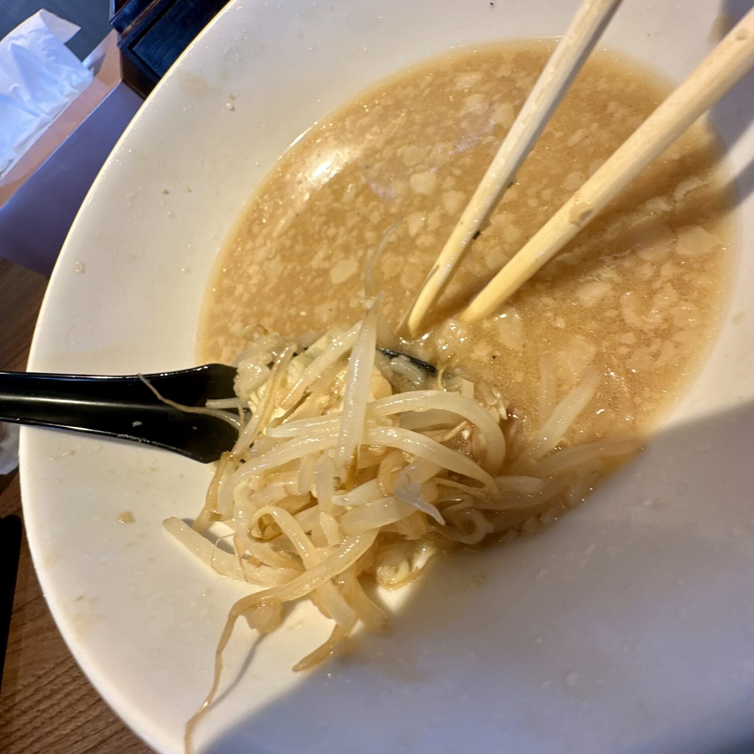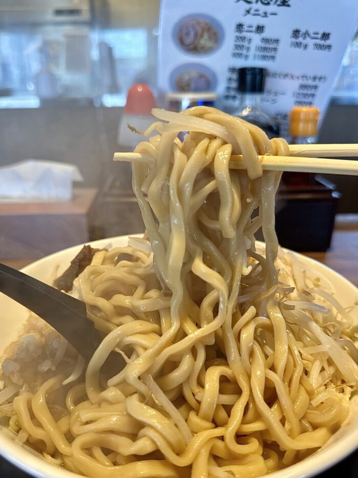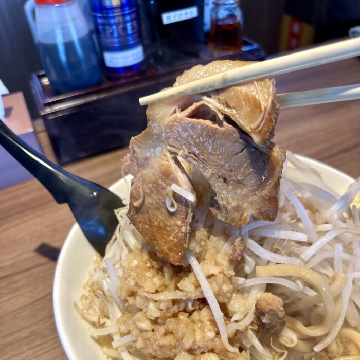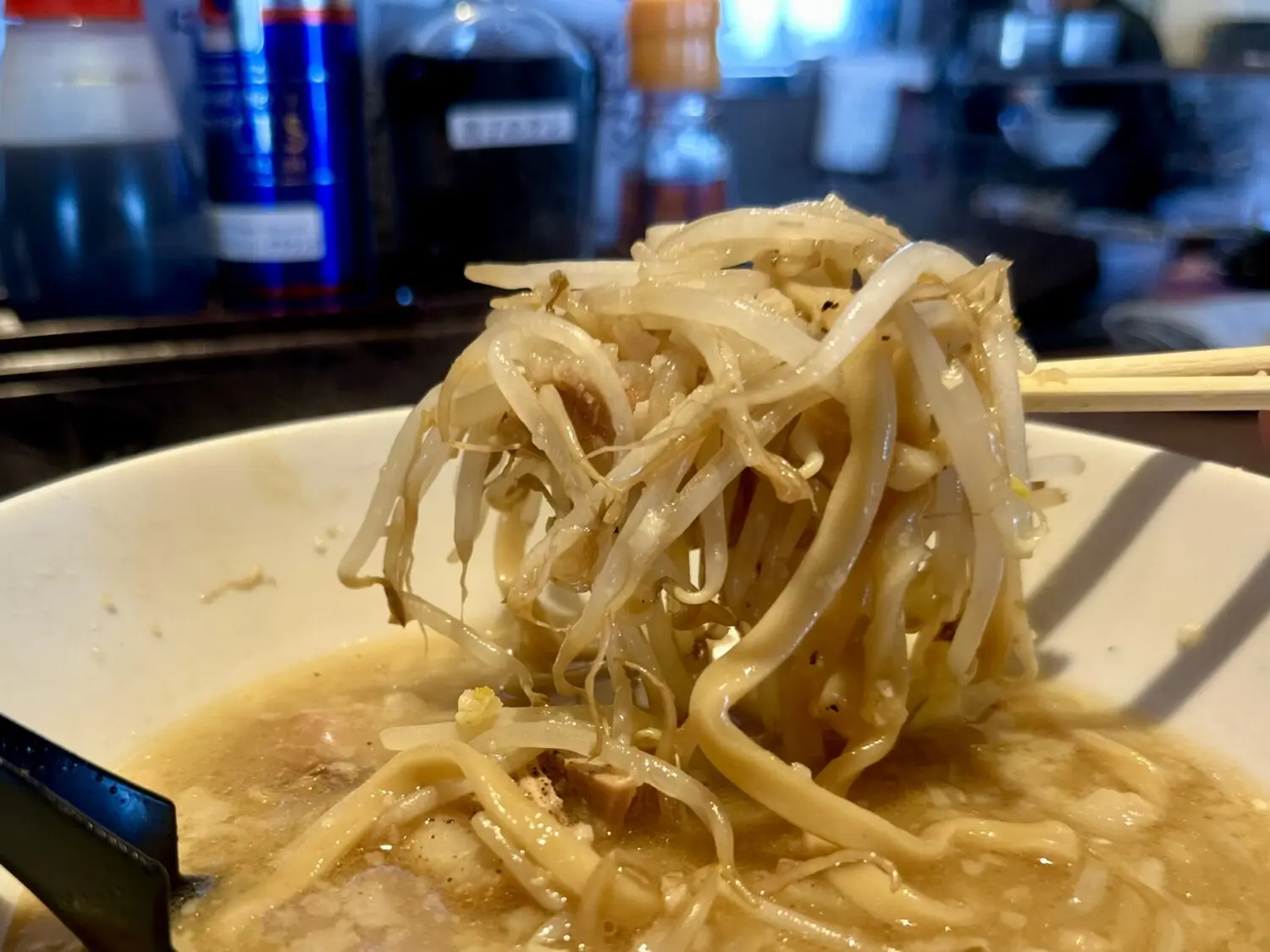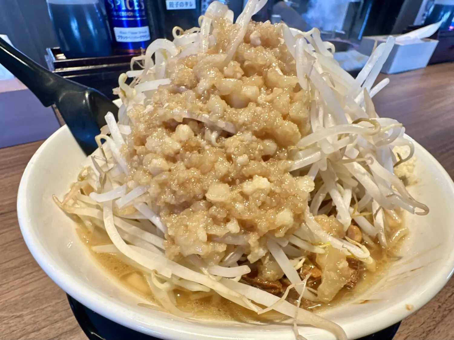 老若男女に楽しんで欲しい、と言わんばかりのジャンク度抑えめな控えめソフトなスープに”二郎”らしさっぽい平打ち太麺、そしてモヤシの茹でガマリが鼻くすぐる大量ヤサイ。